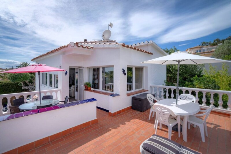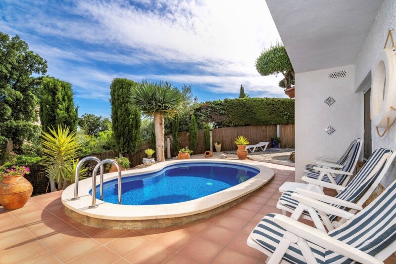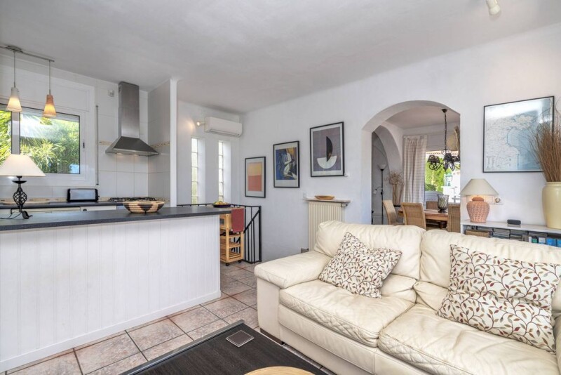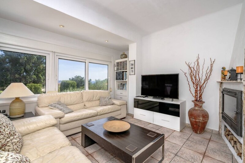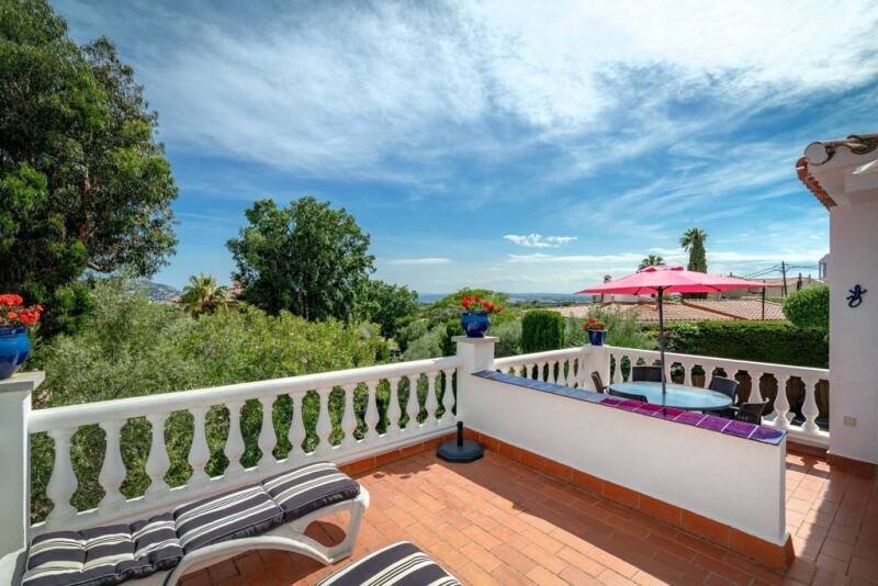 The property with sea views is located in the popular urbanization "Mas Fumats" near Roses. The house is built on two levels and consists on the upper floor of a living room with kitchenette and fireplace, as well as two spacious terraces. The latter offer wonderful views of the surrounding vegetation and the sea. The lower floor consists of three bedrooms, a bathroom and a suite with its own large bathroom. There is also a room with a summer kitchen from which you can access the well-kept garden with kidney-shaped pool. The house has gas central heating, split air conditioning in the living room and in the suite, as well as two private parking spaces. A house in an idyllic setting to feel good.