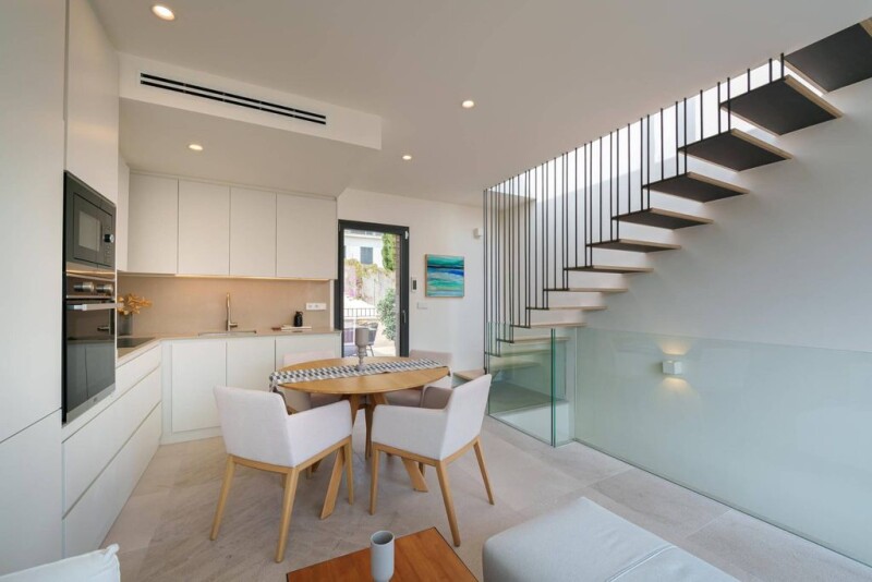 This exclusive and exquisite promotion consists of ten townhouses, all of them with stunning sea views and views of the Bay of Palma. The properties consist of three floors, each with ample living space complemented by spacious terraces, a charming patio adorned with a wide variety of Mediterranean flora, and a rooftop lounge area with a pool, all with views of the Bay of Palma, fostering an atmosphere of pure relaxation amidst the bustling urban landscape. Harmoniously combining contemporary architectural design with the seductive essence of the Mediterranean, this promotion exudes an elegant charm. The impeccable craftsmanship and top-quality materials ensure the highest quality, while each house features two to four bedrooms, a minimum of two bathrooms (including one en-suite), an open-plan living area with a fully equipped kitchen, and an underground parking space. There is the possibility of acquiring an additional parking space. Other features include air conditioning with heating and cooling capacity, underfloor heating, exquisite wooden or natural stone floors, and a well-equipped kitchen. The built areas range between 143m2 and 223m2, complemented with sea-facing terraces from 66m2 to 105m2. Prices for these exceptional residences range from 675,000 euros to 1,050,000 euros. Located in the prestigious El Terreno neighborhood, these residences offer an unparalleled location just a few minutes from the picturesque Bellver Park, the vibrant Santa Catalina district, the lively city center of Palma, and the charming port with its captivating seafront promenade.