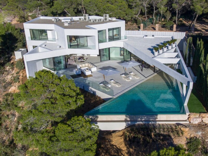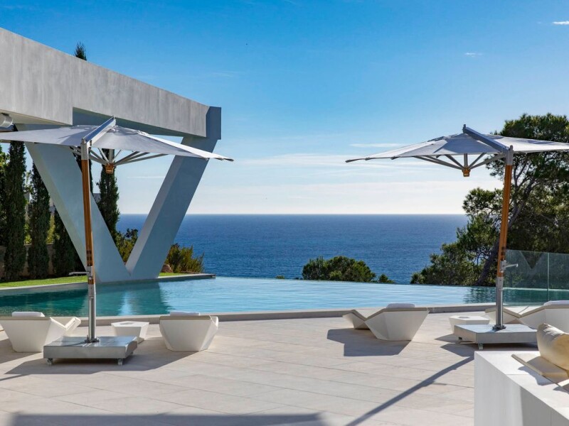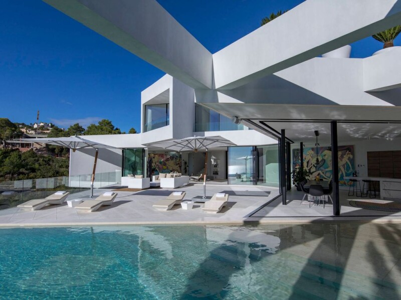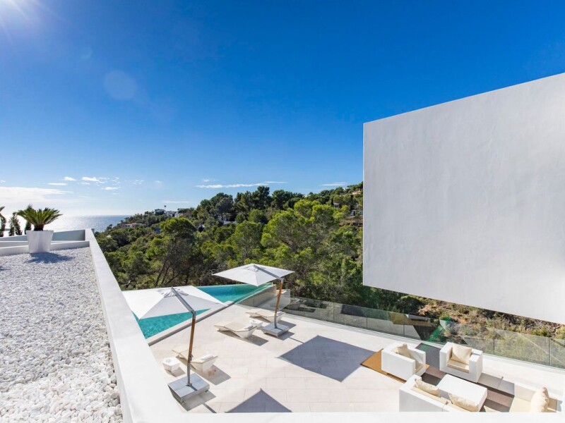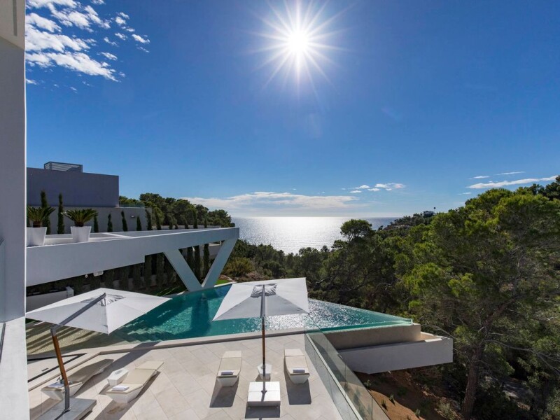 This unique, newly built luxury villa is located in the popular area of Es Cubells. The property impresses with its outstanding quality and uninterrupted sea views. The living space of this special villa is spread over two floors. It is equipped with a large light-flooded living area, an open designer kitchen, 6 bedrooms with en-suite bathrooms, plus a separate one bedroom apartment also with an en-suite bathroom. On the ground floor, there is a living room and a dining room, which are equipped with high-quality interior furniture. There are many sitting and relaxing possibilities both in the living dining area and on the terrace. Behind the very elegant and high quality designer kitchen there is a further professional kitchen. This industrial kitchen is separated from the social entertainment kitchen by a sliding door. By elevator or via the stairs you reach the first floor, where you will find the exclusively designed bedrooms and bathrooms. All bedrooms have en-suite bathrooms and most have the same unique view of the sea and the surrounding countryside as from the terrace. The garage has enough space for 6 cars, which can drive in and out comfortably. It is also possible to park up to 10 further cars outside. The elevator goes from the garage to the ground floor or to the top floor. The complete house is equipped with a spectacular light and sound system and WiFi is available throughout.