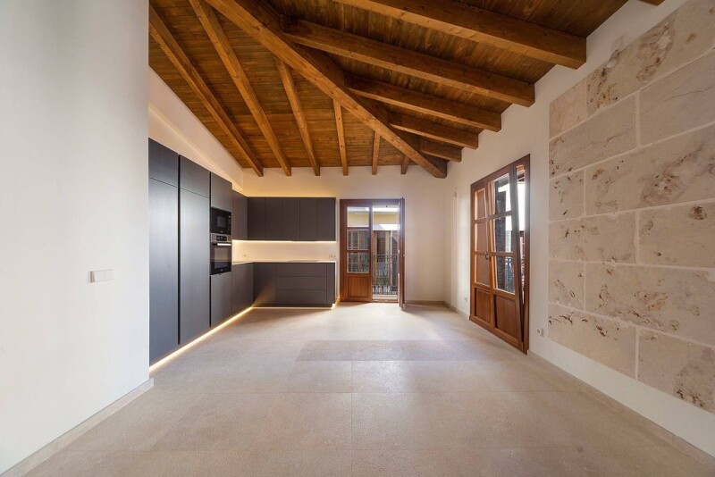 This newly built penthouse is located in a newly refurbished building situated in one of the small quieter streets in Palma´s old town. The property is within walking distance from cafes, exclusive restaurants and shops. This 120m2 penthouse is distributed into a bright living/dining room with a fireplace, a modern open-plan kitchen featuring three balconies, and three bedrooms, each with its bathroom en suite. From the master bedroom, you have a private entrance area to an 8m2 private patio which is on the same level, that provides an idyllic outdoor space with various possibilities. Additional features: include a beautiful blend of various wooden elements, underfloor heating and air-conditioning (hot/cold). Another special feature of the property is the private roof terrace, which can be accessed via the communal staircase. In addition, the garage can be used for parking a large car, and also as a storage room. The apartment has wooden beams and tiled throughout—the ideal penthouse for city living.