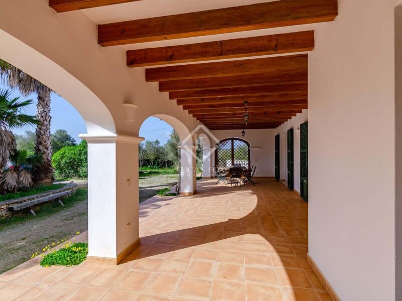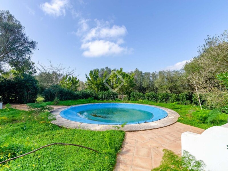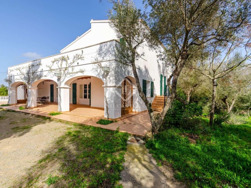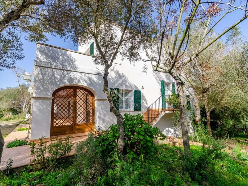 350 m² farmhouse built on an elevated plot of 43,851 m² on one of the most charming roads in the southeast of Menorca. The house, which was built with all kinds of details and enjoys partial sea views, consists of three floors. On the ground floor we find the entrance hall, kitchen, laundry room, living room with large fireplace and access to a covered porch, a double bedroom with built-in wardrobes, bathroom and garage. Going up the stairs we reach the first floor, where we have a double bedroom with private bathroom and access to the terrace, another double bedroom with access to the terrace, two double bedrooms (all with built-in wardrobes) and three bathrooms. In the basement there is a machine room and a storage room. The house has oil-fired underfloor heating, air conditioning, fiber optics, electricity and community well water. The exterior offers a beautiful circular pool with the possibility of extending it in a rectangular shape, a garden area, a ruined barn and a large plot of land with beautiful native forests and pasture areas. Without a doubt, a charming home for a relaxing time in Menorca.