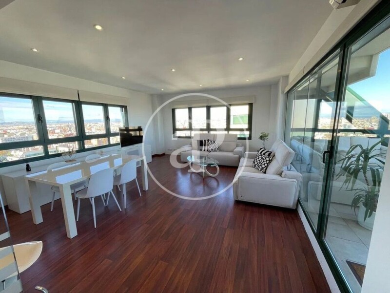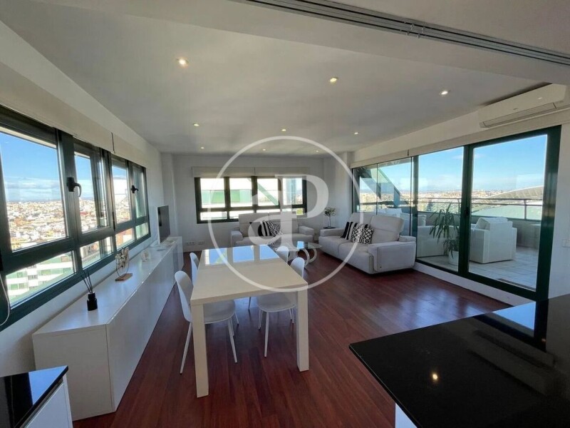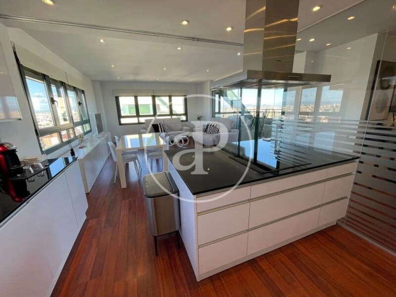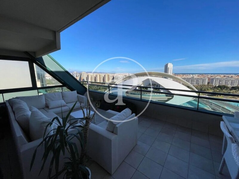 If you are looking for a unique home, aProperties presents this spectacular penthouse on the 19th floor, right in front of the iconic City of Arts and Sciences. With 134 m² built, this property combines spaciousness, comfort and spectacular views of the City of Arts and Sciences, as well as the entire skyline of Valencia. The large terrace and private balcony are perfect for enjoying the outdoors, while the interior is functional and designed to make life more comfortable. There are two spacious bedrooms with built-in wardrobes, a living room that connects to the terrace and provides a pleasant feeling of spaciousness, a modern and well-equipped kitchen, and two complete bathrooms, one of them en-suite. The building, built in 1999, has a lift and is surrounded by green areas. A parking space is included in the price, which is very practical in this area. The location is ideal, with quick access to shops, schools, public transport and the main transport links. If you are looking for a home with unique views, well distributed and in one of the best areas of Valencia, this penthouse is an option you won't want to miss out on. Contact us and come and see it. It could be the home you are looking for.