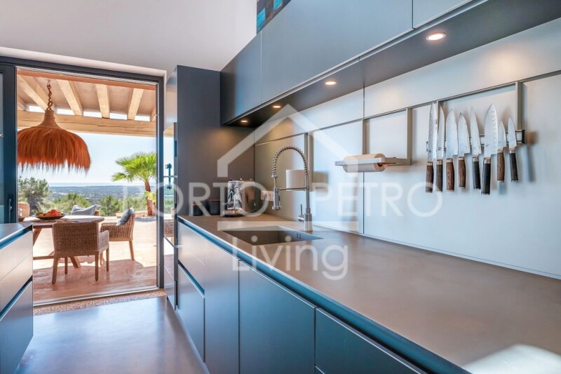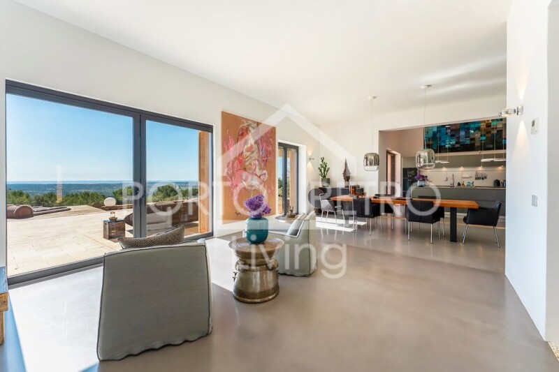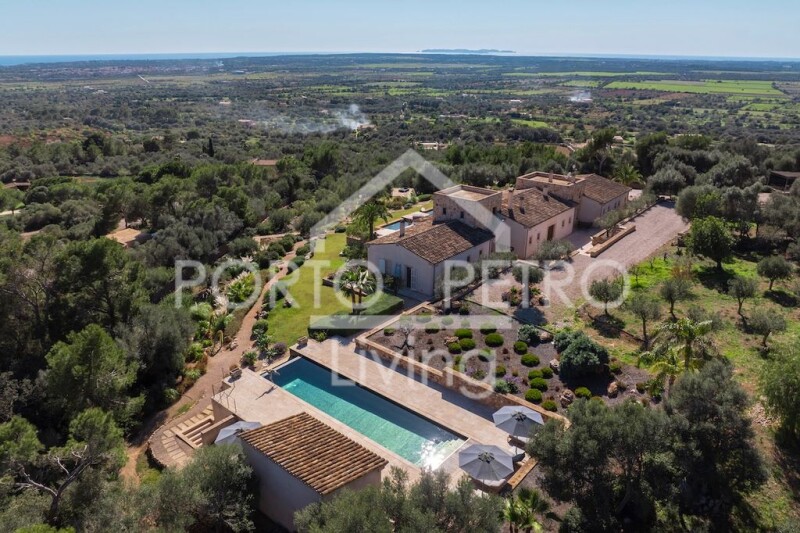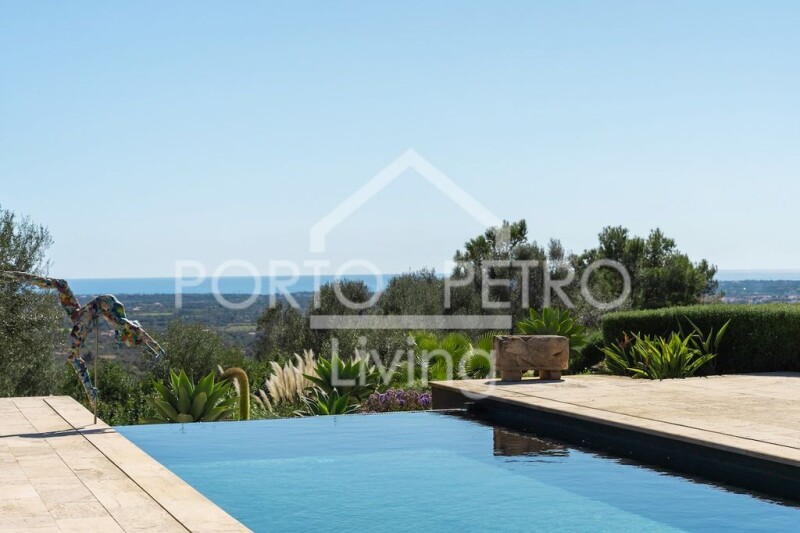 Stunning finca in a unique location with an infinity pool, spacious underground car park and sensational views of the open sea, Santanyi and the island of Cabrera Ref. PRO219 This finca is located in the most exquisite location - at the highest point of a mountain in the immediate vicinity of Santanyi. Here you can enjoy absolute privacy and peace with fantastic views over all the villages on the southeast coast and the diverse landscape all the way to the open sea on the horizon and the island of Cabrera - views that cannot be caught despite the use of the most modern technology - visible from both the outside and the inside of the finca! Stylistically, traditional building elements and rustic, original finca areas, such as the dining area with traditional stone oven, the donkey enclosure or the own olive plantation, in combination with the most modern design and high-quality furnishings as smart home, create a domicile that offers the desired mallorcan lifestyle at the highest level - transported in the most comfortable way possible. The heart of the finca on the ground floor offers you a very large living area, consisting of a living room with a fireplace corner, a dining area with an open kitchen including a built-in kitchen from "Bulthaup" with cooking island, appliances from "Gaggenau", "Bora" hob with tepan stainless steel grill as well as a custom-made wine fridge and adjoining catering & pantry room. You can also expect a representative entrance hall with a cloakroom and guest toilet. There is an impressively spacious master area, divided into a bedroom with en-suite bathroom - with a free-standing bathtub and built-in fireplace an additional, separate toilet as well as a separate dressing and TV room. There also are three additional bedrooms and two bathrooms on the ground floor, one of which is a studio with a small pantry and its own entrance with a terrace in front. On the upper floor, which is accessed via a separate entrance, there is a fifth bedroom with an en suite bathroom. Outside you will find a pool house with a sauna and relaxation area, a toilet and outdoor shower as well as an infinity pool 15m long and 4m wide with a breathtaking view. A romantically landscaped garden with various natural stone paths, teak walkways, ponds, mediterranean shrubs and plants as well as ever-blooming lilacs ("limonium") create an equal atmosphere, which is beautifully accentuated by sophisticated lighting at dusk and at night. An underground car park with 3 parking spaces and a high-voltage connection for e-mobility, an additional carport and various other parking spaces throughout the property complete the considerable space available on this property. The finca is also excellently developed - as you drive your car on a fully paved road to the underground car park. To give free rein to one’s creativity, there is a separate little house available as an artist's studio. A well ensures an excellent water supply. Electricity is obtained from the public grid, supported by an own photovoltaic system. Two air heat pumps from Daikin with an additional connection to solar thermal energy are used to prepare hot water and operate the floor heating. In addition, the entire house has separately controlled air conditioning. This sophisticated energy concept and the high structural quality of the finca ensure low consumption. The energy certificate shows a B classification - a rarity on Mallorca! A bus system from Loxone also makes this property a true smart home: intercom, heating, shading, lighting and much more can be controlled and regulated not only via local switches, but also remotely via an app on a smartphone or iPad. Satellite TV and internet are of course already installed. Details: - finca - unique location, highest point of a mountain near Santanyi - panoramic views - modernization 2018-2019 / original year of construction approx. 2008 - 583 m² constructed area + 404 m² of terraces - 36.199 m² plot area - 5 bedrooms (one of which is a master, also with its own dressing and TV room) - 4 bathrooms + 2 separate toilets (including 1 guest toilet) + 1 toilet in the pool house - open kitchen including EBK from Bulthaup with cooking island, appliances from Gaggenau, hob from Bora with additional tepan stainless steel grill and custom-made wine fridge - additional catering & pantry room - large dining and living room with traditional, open plan and modern built-in fireplace - representative, open entrance hall (with direct access to cloakroom + guest toilet as well as catering & pantry room) - various, spacious terraces as sun loungers and outdoor lounge and dining areas - infinity pool (approx. 60 m² water surface = 15 m x 4 m) - pool house with sauna and relaxation area (partly covered), toilet and outdoor shower (cold and warm water) - romantic garden (incl. old trees and around 50 olive trees for producing your own oil from Mallorca) - automatic irrigation system - accentuated outdoor lighting - car park with 3 parking spaces and high-voltage connection for e-mobility, carport with 3 parking spaces and various other parking spaces on the property - separate house as an artist's studio - Finstral “Slim-line Twin” windows, aluminum, with integrated blinds - sliding doors from Finstral, aluminum, some without center posts, with external blind system - shutters (Persiana), wood, white-cream - air heat pumps from Daikin “Altherma” + solar thermal energy for hot water preparation and operation of floor heating - photovoltaics for additional electricity generation - separate system for air conditioning: Daikin air conditioning systems, outdoor units, indoor with ventilation ducts and integrated ventilation outlets - bus system from Loxone for a smart home: Intercom, heating, shading, lighting & much more can be controlled and regulated not only directly via a switch, but also remotely via an app - satellite TV & internet - water: well - waste water: septic tank - electricity: public