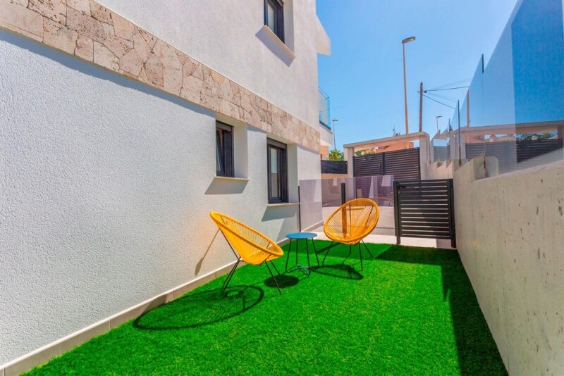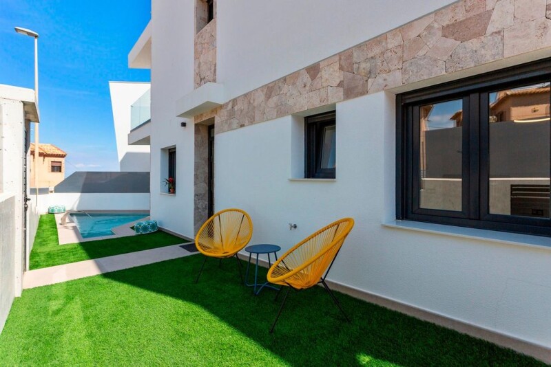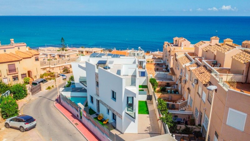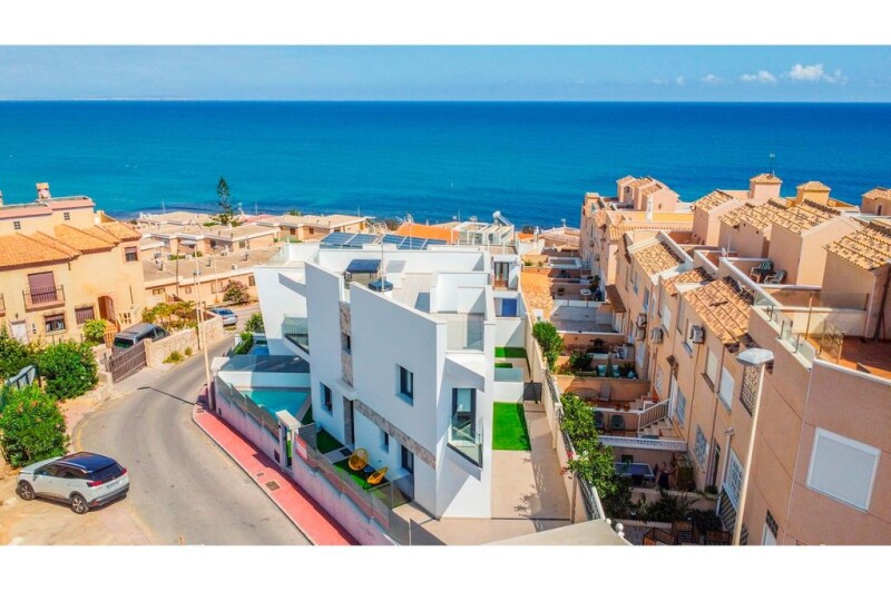 KEY READY VILLA ONLY 120 metres from Torre La Mata Beach. It’s a project of 2 key ready villas situated in the beautiful area of Torre La Mata on the outskirts of Torrevieja. The villas are located a short walk from the stunning beach and a selection of bars, shops and restaurants. The villa comprises of an open plan lounge, dining area and kitchen with patio doors leading out into the private garden with swimming pool and sun terrace. Also on the ground floor there is a double bedroom with fitted wardrobes and a guest bathroom with under floor heating. On the first level there is a master bedroom with fitted wardrobes, en suite bathroom with under floor heating and a private sun terrace, another double bedroom with fitted wardrobes and a further en suite also with under floor heating. There is an internal staircase leading up to a private rooftop solarium with jacuzzi and chill out area where you can enjoy the all-day sun. The internal staircase from the ground floor also leads down to a large underbuild with a fitted bathroom. This space could be used as further bedrooms, office space, cinema or gym. Each villa includes swimming pool, rooftop solarium with jacuzzi, fitted bathrooms with shower screens and underfloor heating, electric window shutters, alarm system, LED lighting in the lounge and on the stairs, pre-installation of air conditioning and fiber-optic. Torrevieja is a large bustling Spanish town which has beachfront promenade with a great selection of shops, bars and restaurants. It has a great community made up of Western Europeans and Spanish which consists of permanent residents and regular holidaymakers. Interested? Do not hesitate and contact our office. We will be happy to help you.