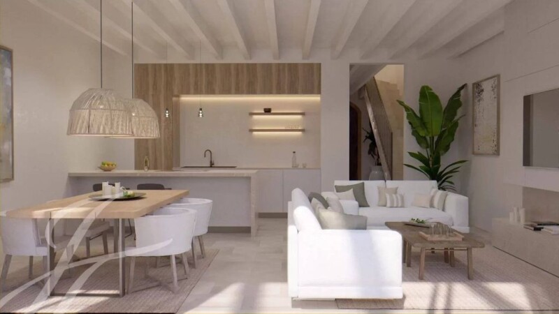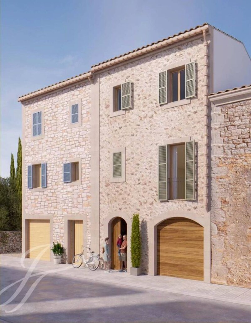 This high quality townhouse is located in a quiet side street in the idyllic village of Santanyi in the southeast of Mallorca. It is a new construction project to be completed in 2023. From the outside, the house is elegant and at the same time traditional thanks to its facade clad with the typical sandstone of the region. The layout of the respective rooms is modern and bright and is made with high quality materials. On the first floor there is a spacious living and dining room, a fully equipped kitchen with an island and a small breakfast bar. There is also a guest toilet and access to the elevator, which leads to the 2nd floor. From the bright living room there is access to the garden area with pool, at the end of the pool is the covered barbecue area and another guest toilet. Attached is the laundry room with all the necessary connections. On the second floor there are two bedrooms sharing a bathroom with shower and one bedroom with bathroom en suite. All rooms are equipped with large windows and fitted closets. Underfloor heating and air conditioning were chosen as a form of heating throughout the house. The master bedroom with dressing room is located on the second floor. The open bathroom is equipped with a bathtub, a double sink, a shower and a separate toilet. The associated roof terrace with Jacuzzi offers views over the rooftops of Santanyi. Santanyi is a charming town located on the southeast coast of the island of Mallorca, in the Balearic Islands, Spain. The town is located in a privileged natural environment, surrounded by hills and a few kilometers from some of the best beaches on the island. One of the biggest attractions of Santanyi is the weekly market held on Wednesdays and Saturdays, where you can find fresh and local products, as well as handicrafts and typical products of the area. In addition, Santanyi has numerous art galleries and artists' studios, making it an important cultural center of the island. The area of Santanyi has numerous beaches and coves with crystal clear waters, such as Cala Santanyi, Cala Llombards, Cala Figuera, among others. You can also enjoy outdoor activities such as hiking, cycling, horseback riding, and enjoy nature. In short, Santanyi is an ideal place for those looking for a quiet and authentic destination on the island of Mallorca, with a great cultural and natural wealth, and a wide range of leisure and outdoor activities.