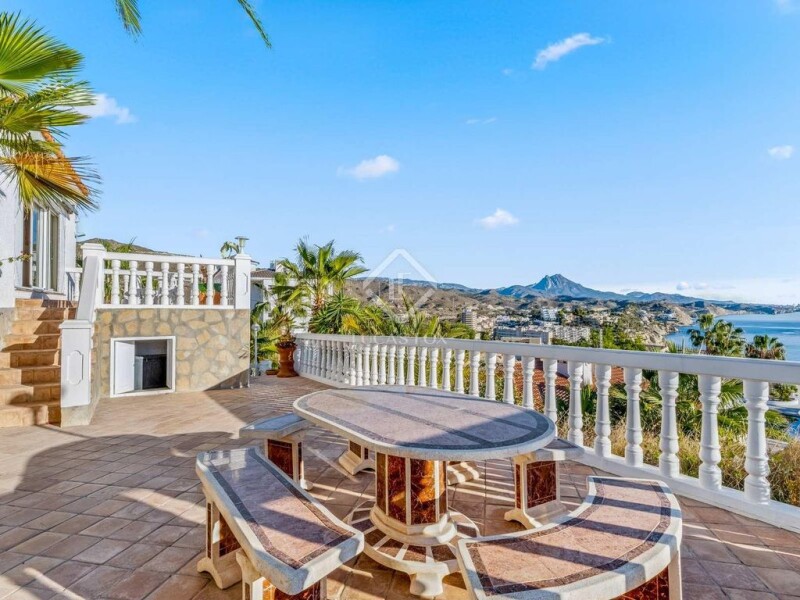 This magnificent house is located on the best street in Pueblo Acantilado in El Campello, just 10 minutes from the centers of El Campello and Villajoyosa. It is a quiet area, which stands out for having the best sea views in the entire province of Alicante. It has very good connections, thanks to the tram station a 10-minute walk away, as well as the national road N-332 and the AP-7 motorway. The closest beach is Cala Lanuza, which is a 10-minute walk away. The plot of more than 1000 m² offers numerous corners to enjoy the views: from its beautiful terraces, we can contemplate the mountains and the sea, passing through the city of Alicante and its castle to the island of Benidorm and the impressive Puig Campana, the second highest mountain in the region. There is also a large swimming pool to cool off on summer days and a summer kitchen to enjoy meals with family and friends. The plot also has a garage for three cars, as well as palm trees and several fruit trees. As for the house, it is distributed over two floors that can be left independent, depending on the use you want to give to the spaces. On the ground floor, we have a entrance hall, a ensuite bedroom that can be used as a living room, a kitchen with a pantry and technical room, two additional bedrooms and another full bathroom . Going up to the main floor , we have numerous rooms with views of the sea and the mountains: three large living rooms (two of them with fireplace), a semi-open kitchen with sea views, two bedrooms and two complete bathrooms. The 1982 house has been perfectly maintained with top quality materials, electric shutters, split air conditioning and large windows. Get in touch for more information.
