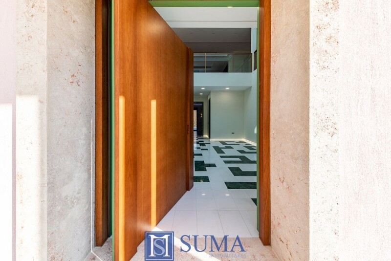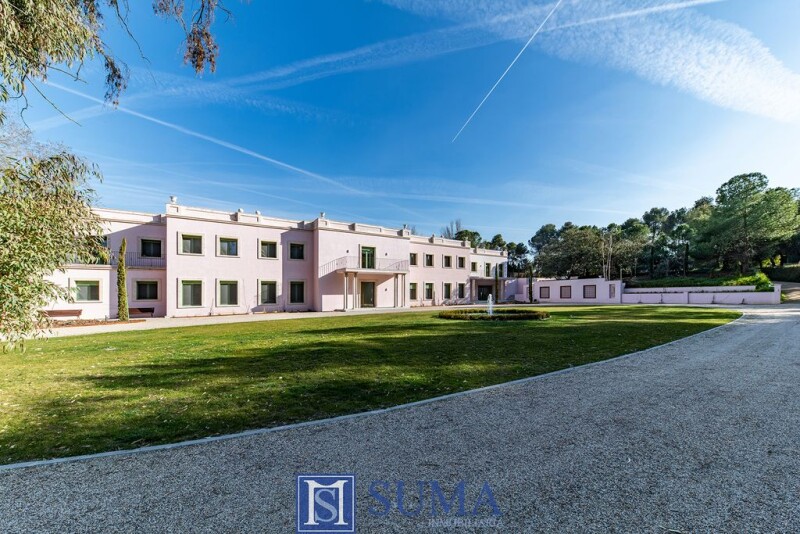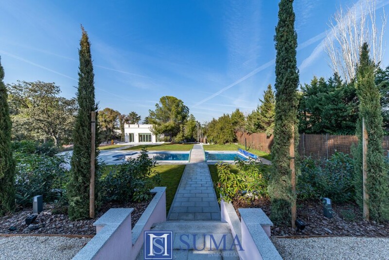 Suma Moraleja offers a detached house in the most privileged area of La Moraleja. A house of more than 2,000m2 has been built on a wonderful one-hectare plot. Its distribution is divided into two main floors and a basement. Seven bedrooms and two service bedrooms, each with its own bathroom. Large gym, indoor pool, outdoor pool, sauna, cinema and wine cellar. Each and every one of the spaces is of large dimensions. The house has just been finished and is located on a beautiful one-hectare plot, with approximately 10,000 m2 available with an established garden for your enjoyment and great privacy. The entrance floor is presented through a spectacular oval front garden with a fountain, something that gives the property great majesty. The hall, of great height and volume (about 55 square meters), is crowned by a glass roof with a striking design. The hall contains two guest toilets and two coat closets. From the hall you can access the dining room (89 square meters), the large main living room (almost 200 square meters) divided into three very different areas and a second distributor (48 square meters) from where you can access (by stairs or elevator) the upper floor. This second distributor also leads to the kitchen and a full bedroom with bathroom. This level is completed with a garage on the surface for 6/8 vehicles. The upper floor houses the bedrooms that revolve around the surface generated by the hall due to its double height. Six bedrooms with five bathrooms, all of them large (the main one about 100 square meters). The master bedroom with a large dressing room and two full bathrooms. This level gives access to the summer area: living room with fireplace, dining room with full kitchen, full bathroom and a bedroom with toilet. All these rooms overlook the beautiful swimming pool with bridge and complete relaxation and chill out area. The semi-basement floor houses the indoor swimming pool with sauna and large gym, full bathroom, cinema, wine cellar, laundry and two suites for the staff. The house, in addition to a covered garage, has a large parking space for ten cars. Natural gas underfloor heating and air conditioning throughout the house.