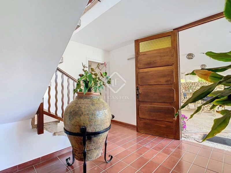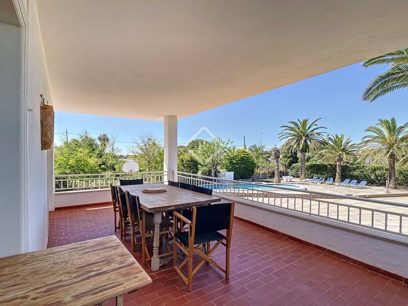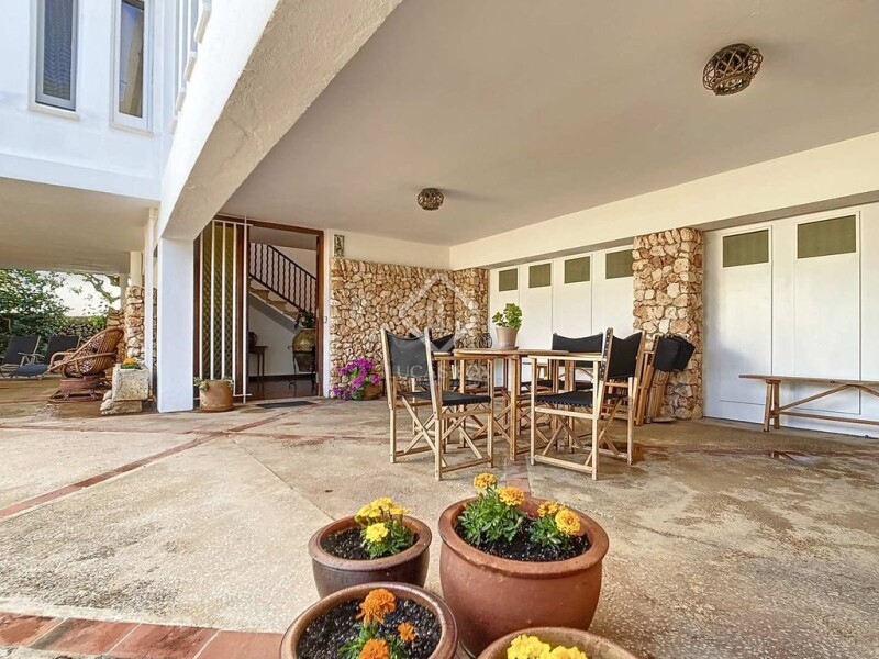Lucas Fox presents this wonderful 579 m² villa built on a 1,681 m² plot a few meters from the centre and Sa Platja Gran in Ciutadella de Menorca. The entire property is distributed on the first floor with a constructed area of 230m² and three terraces that make a total of 62m². From the different covered entrance porches on the ground floor that have a total of 200m² built, we access the interior of the property. Once inside, on the ground floor we have the entrance hall that leads us, on the right, to a pantry area, bathroom, storage room and garage. Via a comfortable staircase we reach the first floor where we find a entrance hall that on one side leads us to a bedroom or living room, which in turn connects to the back of the kitchen with access to a sunny terrace. From the hall, we go to a entrance hall with a large sliding glass door that allows natural light to enter the entire room and leads us to the spacious living-dining room with a wood-burning fireplace and access to a splendid 20m² covered terrace, ideal for spending time. evenings with family and/or friends. Returning again to the entrance hall, to the right we find the separate kitchen with a large utility room area and access to the rear terrace. From the entrance hall on the first floor, we go to a spacious living room with access to a comfortable terrace facing south. From this room and through a hallway, we reach the night area with five bedrooms: one single, three doubles that share two bathrooms and the main bedroom with a private bathroom. All bedrooms are exterior with access to a balcony, built-in wardrobes and air conditioning and heating splits. The bathrooms were recently renovated. The property is very spacious and bright, thanks to the number of windows that surround the entire house. Since all the building space is not exhausted, there would be the possibility of expanding. Exterior we find a wonderful entrance lined with palm trees, a pleasant 40 m² swimming pool with a solarium area, a garden , several covered porches with a barbecue area and exterior parking areas . Without a doubt, an ideal property to live in all year round due to its proximity to the city centre or a very good investment opportunity as it has a tourist license and can be rented seasonally. Contact us for more information or to arrange a visit.