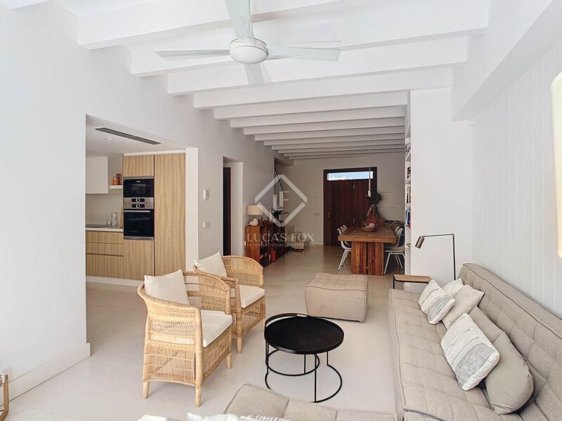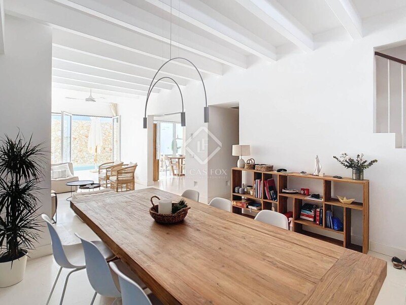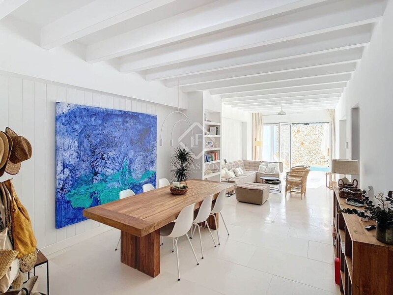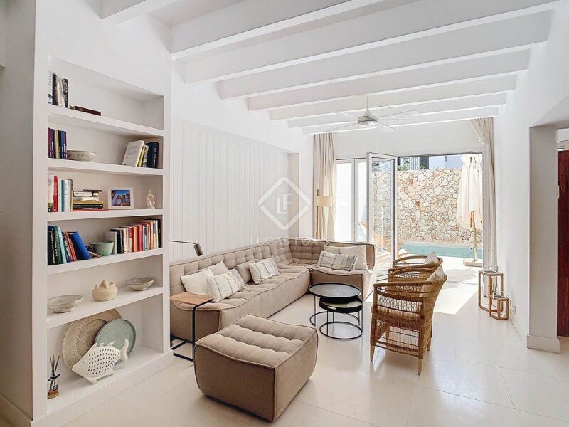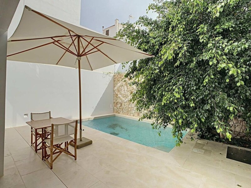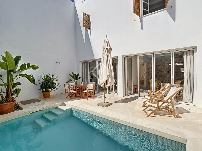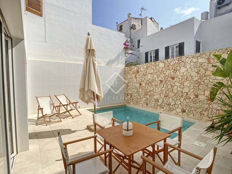 Lucas Fox presents this 257 m² house with a 40 m² patio and a 30 m² terrace with solarium in the historic centre of Ciutadella de Menorca. The property, completely renovated in 2018, is distributed over three floors. The ground floor welcomes us with a beautiful entrance with access from the street. Once inside, there is an open entrance hall that leads us to the large living-dining room and access to the kitchen diner equipped with high-end appliances , both spaces with access to a cozy patio with a 13 m² pool. This floor also has a guest toilet, a garage for one car and a beautiful staircase that takes us to the upper floors. On the first floor, we find a hall with built-in wardrobes, three double bedrooms with built-in wardrobes and a private bathroom. From this floor, going up a staircase, we reach the second attic floor , where we find a very spacious double bedroom with access to a terrace with distant views of the sea and Ciutadella, a dressing area currently used as a bedroom and access to a utility room room. The house was carefully renovated using high-quality materials and retained typical features of the houses in the historic centre of Menorca, such as white-painted exposed beams and sandstone in the courtyard. It has an alarm, ducted air conditioning, underfloor heating by aerothermics energy, double-glazed accordion-style enclosures in the kitchen and living room, porcelain floors on the ground floor and wide-plank parquet floors in the bedrooms. At present there is no fireplace in the living room. Without a doubt, a unique property to live in all year round or spend time with family and/or friends. Please contact us for more information or to arrange a viewing.