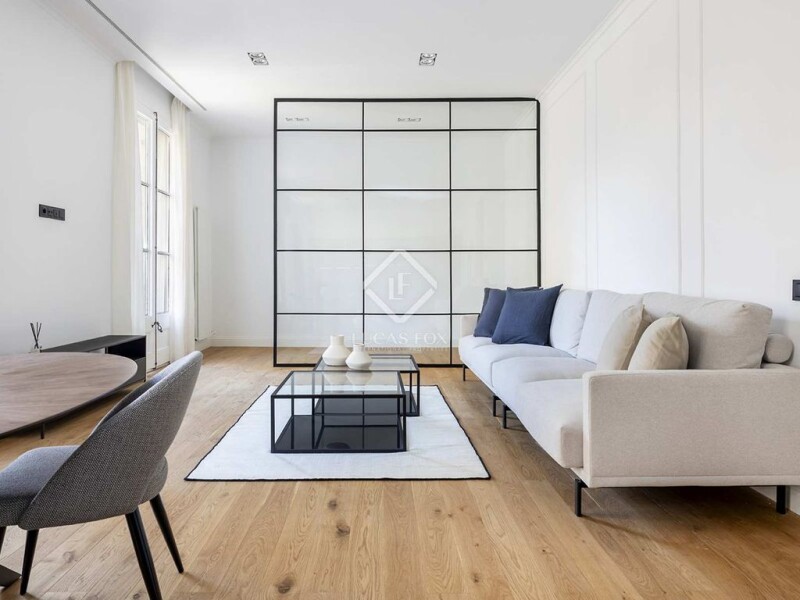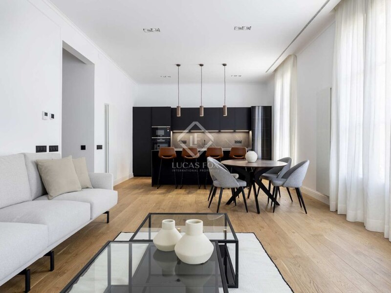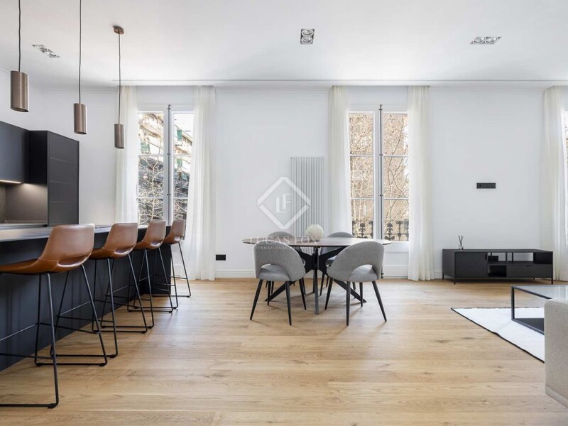 Right in the heart of the city centre, next to emblematic streets such as Passeig de Sant Joan and Avenida Diagonal, we find this classic and recently renovated corner building that has the classic architectural characteristics of l'Eixample. In addition to being fully refurbished to complete the technical inspection of the building, there is also concierge service, a beautiful classic lift on either staircase and a communal terrace with breathtaking views of Sagrada Família. The apartment spans 140 m² and is composed of 3 double bedrooms and 3 bathrooms. The day area is extremely spacious and bright, with tall windows leading out to a beautiful, wide balcony overlooking the street. The windows are double-glazed and feature an acoustic and thermal bridge, ensuring optimal energy efficiency in the apartment. The SANTOS kitchen is open plan and fully equipped with high-end appliances. The big central island opens up to the dining-room area and living space beautifully, allowing optimal interaction with guests. Its dual aspect is to be highlighted, as it allows abundant natural light through the tall floor-to-ceiling windows. This apartment boasts high ceilings, natural wooden flooring and high-end finishes all throughout. The air-conditioning and heating are ducted and there are also gas radiators which facilitate temperature control. The curtains are motorized, and the lighting can be controlled remotely. There is also a laundry area with washer and drier. The night area is composed of three double bedrooms. The main suite is overlooking a quiet interior patio and boasts a cosy balcony, en-suite bathroom and custom-built wardrobe. There is a second complete bathroom, which is separate, and a guest toilet, completing this area. Contact us to arrange a tour of this state-of-the-art apartment. It is a unique purchasing opportunity in the most sought after area in the city.