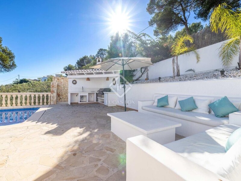 A wonderfully presented family villa, with spectacular outdoor areas, and lovely views over the hillside, set in the peaceful, residential area of Costa Nova Marina, near to Granadella beach in Jávea. This lovely property has been incredibly well thought out to offer modern comforts and to be able to joy the ease of outdoor living in the Mediterranean sunshine. Large gates lead down to the off-road parking area, and the front door, with entrance hall to welcome guests and family, which leads in turn to the open-plan indoor living area, complete with living room with open fireplace and feature staircase upstairs, spacious dining room which is open to the superb and wonderfully spacious, fully-equipped kitchen. There are three large, glass doors which lead from this central hub to the outdoors, via the utility area and beautiful traditional covered terrace. Also on the ground floor are two double bedrooms, both with built-in wardrobes and blackout shutters, and a family shower room. The upstairs of the property is dedicated exclusively to the principal suite, with en-suite shower room and a spectacular open terrace, perfect for watching the sunrise with a coffee. Outside, we have the 2 arch naya terrace which is the perfect shady spot under which to dine, read or watch as the family splash around in the 8x4 swimming pool! There is also an Ibiza-style chill out area, with built-in white sofas and a full summer kitchen with built-in BBQ and complete with secret outdoor shower behind. Below the pool level, is a lawned garden, with trampoline area; perfect for children and pets, and a small vegetable patch. There is also a storage room on this level. This property has been rented out with an incredibly competitive rental return, with rental history and guests keen to reserve for 2025! Practical extras include: gas central heating, private gas tank, outdoor shower, full outdoor lighting and watering systems, air conditioning throughout, alarm. ADDED BONUS: There is also the option to buy two building plots adjacent to the property to guarantee privacy, or why not build a tennis court or guest house in the future! 175.000 EUR per plot.