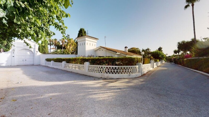 Villa 50 Very Charming Classic Andalusian beachside 4 bedroom villa in Paraiso Barronal Location Unique opportunity to acquire a second line beach front, 80 meters away from the beach, less than 5 minutes walk to shops and restaurants, a 10 minutes drive to Puerto Banus. Paraiso Barronal is a wealthy and peaceful area midway between Puerto Banus and Estepona. Property Surrounded by a very large garden, the villa has 249 sqm built plus terraces and consists of a long ground floor, a lower ground floor for the indoor parking, and on each aisle of the villa sits a second level with a bedroom suite. Ground floor Wide open space with, from the entrance, living room with a fireplace, and dining room, with direct access to a countryside-like kitchen. The kitchen has access to a small yard, which in turn allows the access to an independant bedroom or sitting room and its bathroom. On the other side of the living room there is a bedroom with its bathroom. Upper ground floor There are two ensuite bedrooms, each one of them situated at opposite sides of the house, and each one of them with their bathroom. A mezzanine sitting room/TV room/ office overlooking the living room precedes the access to one of the upstairs bedrooms, and has a fireplace. Outdoors There are three accesses to the property, from each of the quiet streets that are bordering this property East and West. Each of these entries provides a driveway to the North side of the garden. There is a specific access to the garage from the street. On the South side of the property is the porch that lays all along the villa, and the pool. The garden is very large, providing lots of room for kids' playground, garden parties, or parking for several cars (on top of the indoor parking).