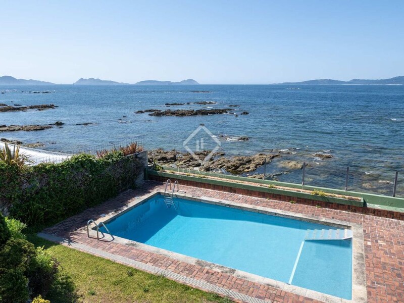 In Canido, one of the most exclusive neighbourhoods in the Rias Baixas, and not far away from the city of Vigo, we find this 4 bedroom beachside property. The house has 600 m² of built surface area distributed over three levels and sits on a good-sized plot right by the beach, with outstanding views of the estuary of Vigo and the Atlantic Ocean. The property is built facing the sea and has very well-defined day and night areas. We enter the house from the street and from the main hall to the left we find a spacious kitchen seamlessly connected to the dining area and a large living room. The living room has wide sliding windows, allowing access to the garden and swimming pool areas. The beach with its blue-green, crystalline waters is just a few steps away. The upper level, which can be accessed via a staircase or with the use of a lift, is where we find the sleeping quarters which have three bedrooms, two of them facing the back and sides of the property and sharing a complete bathroom. The main bedroom has a spacious walk-in wardrobe and overlooks the swimming pool area and the beach. The views of the estuary are breathtaking. On the main floor, towards the back of the property and facing the garden, there is an ample service area with a laundry room and a bedroom with its own bathroom for staff. There is a licenced project to completely refurbish and upgrade this property with a modern design. Please contact Lucas Fox for further details. This property in need of updating would be ideal for a young couple or a family with children wishing to enjoy the beauty and tranquility of the surrounding landscape, but very close to the city of Vigo and all its services.