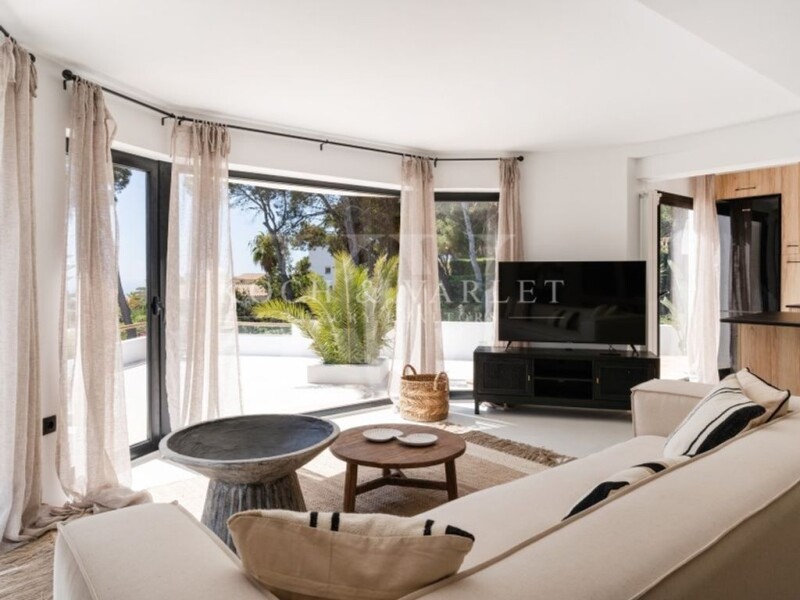 New Mediterranean Ibicenco style villa in Javea, with beautiful sea views, facing SOUTH-WEST in the residential area of Balcon al Mar. On a plot of 1034 m2, it consists on the ground floor of a large living-dining room opening onto the view of the Mediterranean Sea and the surrounding landscape, an equipped kitchen, as well as a guest toilet and 4 double bedrooms each with its own bathroom and built-in wardrobes. On the lower level, where the sumptuous swimming pool, sunny terraces, and lush garden are located, we have an additional independent room, consisting of a summer lounge and a shower room. Perfect if you want to enjoy the coolness inside during the summer season while being close to your family around the pool. Finally, keeping the best for last, on the rooftops of the house is a spectacular solarium of nearly 100 m2 with an unobstructed view of the Mediterranean Sea and greenery. The ideal place to get together with family and friends. The house has a double garage for two cars, is sold furnished, and has reversible hot/cold air conditioning units in each room as well as radiators, an alarm system, and internet. A unique property presented by KOCH & VARLET LUXURY REALTORS S.L., your expert real estate agency in luxury properties on the Costa Blanca in Spain, Denia - Javea - Moraira - Benissa - Altea.