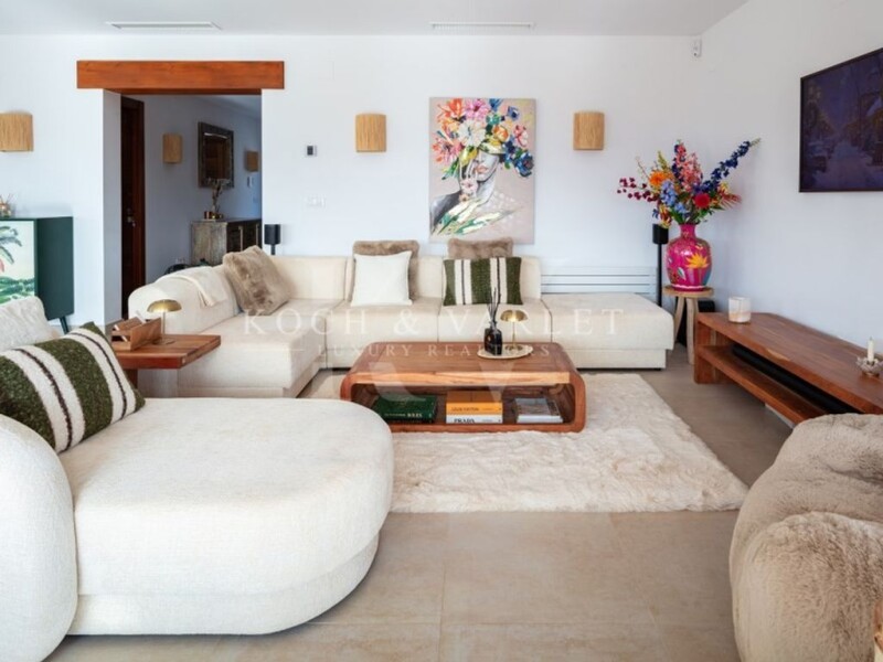 Villa Agave is a spectacular property, recently renovated with an exquisite Mediterranean-Ibizan style that combines elegance, comfort and connection with nature. Located in the prestigious Montgo area of Javea, this property is a true private oasis ideal for enjoying the Mediterranean lifestyle. With a plot of 2,000 m², 320 m² built and more than 400 m² of terraces, this two-storey villa offers spacious and bright indoor and outdoor spaces designed to maximise comfort and enjoyment. It is located at the end of a cul-de-sac, guaranteeing absolute tranquillity and privacy. Upper floor: Entering through the main entrance, you will find a spacious hall that leads to an impressive day area. Here a modern kitchen with a central island, an integrated living room and dining room stand out, full of natural light thanks to its large windows that connect with an extensive terrace ideal for enjoying unique moments outdoors. On this floor you will also find two spacious double bedrooms, both with fitted wardrobes and elegant en-suite bathrooms, as well as a guest toilet. Lower floor: Accessible by both an internal staircase and a separate entrance from the outside, this floor houses three additional bedrooms, all with direct access to a large covered porch. It also has a practical laundry room and a full bathroom, making this area perfect for guests or family. Outdoor area: The exterior of the villa is an authentic Mediterranean paradise. It includes a large swimming pool surrounded by perfectly manicured lawns, fruit and olive trees, a solarium for relaxing in the sun, and a lovely covered area with a kitchen and summer dining area, ideal for hosting meetings and barbecues with friends and family. The property has a large parking area at the entrance, a closed garage and a strategic orientation that allows you to enjoy the sun all day long, heat pump heating, central air conditioning, alarm and solar panels. This villa combines the elegance of Ibizan design with Mediterranean touches, creating a sophisticated and welcoming atmosphere. Its privileged location, its spaciousness and the numerous amenities make this property a unique opportunity for those looking for an exclusive home in Javea, surrounded by nature and tranquillity. Don't miss the opportunity to live in this spectacular retreat. Contact us today for more information or to schedule a viewing and discover all that this magnificent villa has to offer.