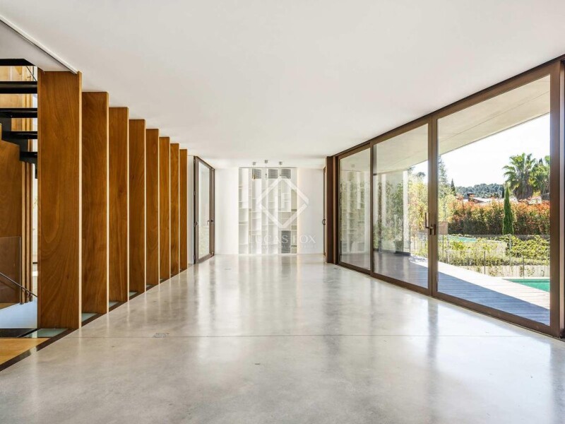 Lucas Fox presents this spectacular villa with a minimalist design, recently built in the exclusive and peaceful area of El Golf de Sant Cugat. The property sits on a plot of 800 m², with a construction of 573 m² distributed over four floors interconnected by a lift. The house receives abundant light thanks to its large windows, which offer a greater feeling of warmth. On the main floor , a bright living-dining room with fireplace connects to the exterior, where we find a porch and an infinity pool. The charming kitchen diner and a guest toilet complete this floor. On the upper floor , the main bedroom has a full bathroom , with shower and bathtub, two dressing rooms and exclusive access to a solarium with stunning views. The night floor houses four large bedrooms with built-in wardrobes and three bathrooms, along with a versatile 70 m² living room. The property includes a garage for four vehicles, space for motorcycles and bicycles, engine room, large laundry area and service room. High-quality finishes include polished cement and wooden floors, electric shutters, home automation, underfloor heating, solar panels, oak interior carpentry, thermal and acoustic double glazing, and air conditioning with hot and cold pump throughout the house. . The villa, located in the exclusive Golf-Can Trabal area, offers excellent connections to the main roads with easy access to Barcelona and its surroundings. The area stands out for its tranquility and proximity to amenities, shops and medical care. At Lucas Fox we know how important it is for you to find your ideal home, which is why we are looking forward to accompanying you in this fantastic process with the help of real estate experts with efficiency, professionalism and dedication. You are just one click away from finding your property, we are passionate about what we do and we are here to serve you. Contact us, you will appreciate the difference!.