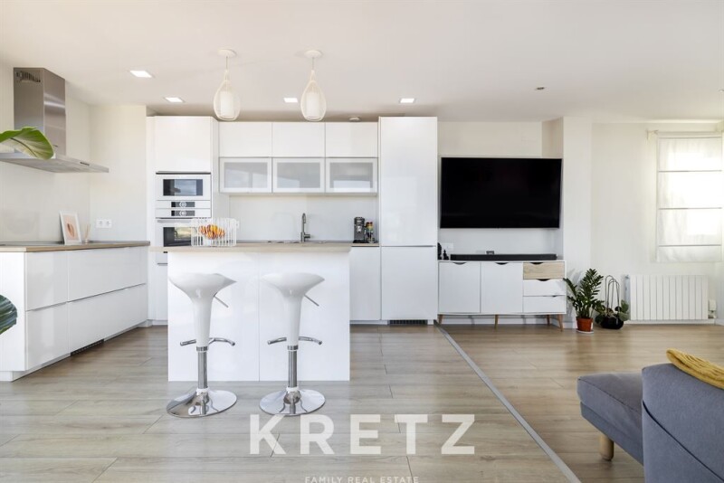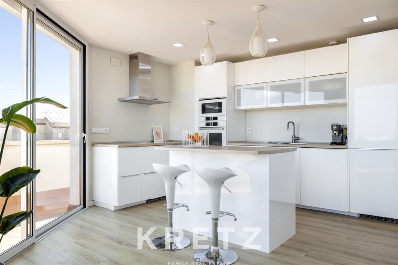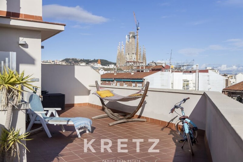 Penthouse in Fort Pienc, Eixample, Barcelona. Corner flat of 114sq m with 65sq m terrace. 47sq m living/dining room with direct access to the terrace. Fully equipped kitchen, with island. 1 Master suite. 2 double bedrooms. 3 bathrooms. Air conditioning, heating. Porter service. Steps from Passeig Sant Joan, a favourite area for young families, surrounded by parks, schools, well communicated, with a wide gastronomic offer and close to the beach.