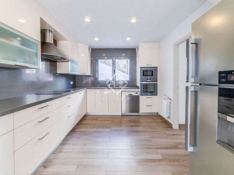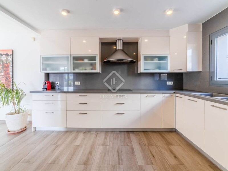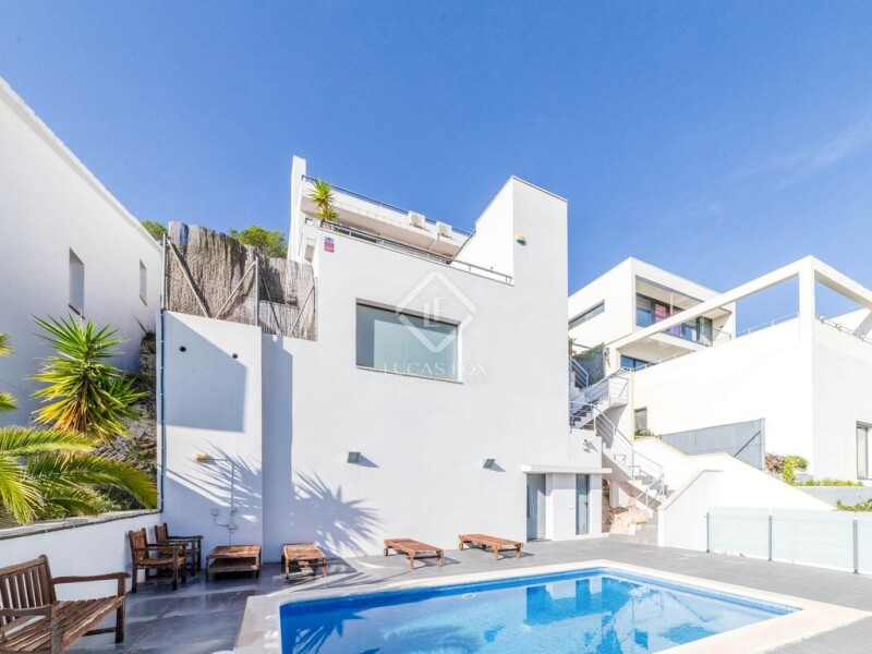 This villa near Sitges offers peaceful views of the hills and the sea. It is ideal for a family as the house offers 5 bedrooms and a separate attic apartment with its own bathroom and large private terrace. The house is accessed from the lower level through the garage which is large enough to accommodate 2 cars and has plenty of space for storage. From here you will find the lift to take you directly to the upper levels either to the pool area or the kitchen and living area. The main entrance opens up to a large corridor, where you will find the guest bathroom with its own shower, the living area with 2 terraces and a fireplace, and the kitchen. The large kitchen is equipped with modern appliances including a large American size fridge /freezer, Smeg 5-ring gas cooker and a breakfast table. You can access the utility room and its own service terrace for hanging out laundry. The upper floor opens up to a large landing area, a large bathroom, and en-suite master bedroom, each bedroom with its own terrace, and stairs to the attic floor. This room has been used as a guest room and as an office space and it offers its own modern shower room and large chill out terrace. Every room has its own air conditioning including heating and central gas heating is also available throughout the house. The house is located close to the bus stop and only a 3-minute drive to Sitges centre and Aiguadolç beach and Port. It is a quiet area; ideal for families as there are several international schools available in the area. The area is very convenient for access to the motorway to get to the airport or Barcelona city. The house is large and therefore it is a great for people who would like to use a it as a family home for themselves and rent it out for holiday rentals. There is a license for the property. It can easily accommodate 12 people, which makes it possible to rent it out to big groups such as 2 or 3 families. High rental yield.