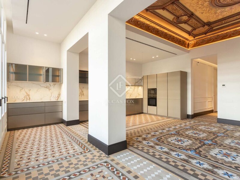 This exclusive property, located in the heart of Barcelona, is located in Eixample Derecho, just one block from Passeig de Gràcia. The 190 m² apartment, with a two-level terrace totaling 124 m², is located on the main floor of a classic modernist building, equipped with a lift that goes directly to the property. This luxurious apartment offers stunning, meticulously restored period features, combining contemporary design with historical elements. The original Nolla mosaic floor and hand-painted ceiling add a timeless and elegant aesthetic. In addition, it combines classic design elements with innovation and technology. It has a home automation system that allows you to control lighting, heating, air conditioning, curtains and blinds from your mobile phone. In the lobby, we find a minimalist panoramic window that overlooks an courtyard covered in wood, with an olive tree in the centre that adds a Mediterranean and cozy touch when entering the apartment. All the exterior lighting is from the Marset brand. The day area is spacious and bright, with views of the terrace. The open concept kitchen and bar area, made by the Italian firm Poliform, give it a sophisticated air. The kitchen is equipped with high-end appliances , such as Miele or Bora. Suspended lighting by David Groppi creates an intimate atmosphere in the dining room. The night area is made up of three bedrooms (two of them en suite ) and a spectacular 44 m² master suite . The master suite has an elegant dressing room with high-quality finishes and a bathroom with underfloor heating in Carrara marble, a double shower, Gessi Venti toilets, Duravit bathtub, double sink and designer lighting by Catellani & Smith and Flos. Additionally, the suite includes an adjacent home office area.