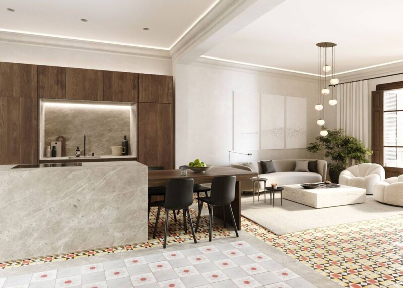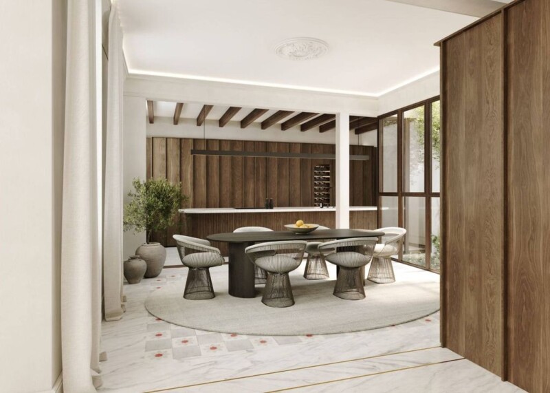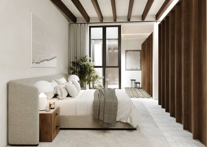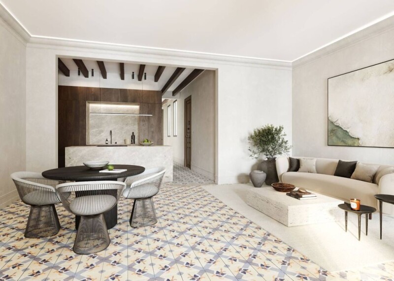 This exclusive triplex apartment offers well-designed spaces on three floors and an exceptional rooftop with a private pool. The lower level is a bright open-plan living room on the street side, a bright dining room with windows on the sides of the terrace. The kitchen is fully equipped with Gaggenau appliances and has a central island, as well as wooden beams and floors and countertops of Volkas marble. Other rooms on this level have restored Mallorcan-style tiles and ceiling moldings. There is also an additional laundry room and a guest bathroom on the lower level. The second level consists of three bedrooms, all with wooden beams. The main bedroom has windows overlooking the main courtyard with a marble and walnut finished en-suite bathroom and dressing room. The second bedroom has marble floors and wooden panels on the walls. The third bedroom, accessed through a private bathroom, is located at the front of the building and has a sloping ceiling and tiled floors. The highlight of this penthouse is the private 72m2 rooftop that extends over two floors. The lower level includes a bathroom with a shower and plenty of space to create seating, dining, and sunbathing areas, while the upper terrace offers 360-degree views over the city, to the sea in one direction and the mountains in the other. It also has its own private rooftop pool. It is located in the old town of Palma, where all boutiques, restaurants, and other services are within walking distance of the apartment.
