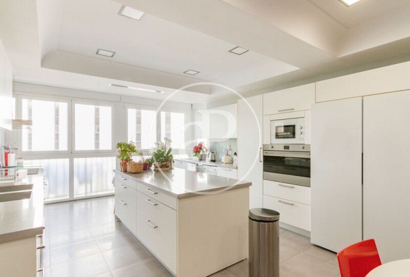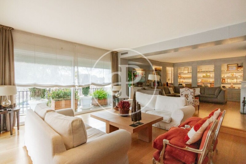 AProperties is pleased to present this spectacular property, refurbished by an architectural studio together with the owners, who have taken care of every detail with high quality standards. This property stands out for its spaciousness, luminosity and elegance, with a total surface area of 580 m² according to the land registry, of which 381 m² correspond to the house. On entering the property, we are greeted by an imposing hallway that leads to the social area and the private area of the house. The design of the layout allows for a perfect separation between the two areas. The social area includes two spacious living rooms and a fantastic dining room, all of them exterior, with direct access to a terrace. The south orientation of the house guarantees excellent luminosity and pleasant warmth throughout the day. From the hall, there is also access to a versatile room, ideal as a guest room, office or living room. This space, adjacent to a full bathroom, offers great independence and privacy for guests. The service area, with a separate entrance, houses a contemporary kitchen, fully equipped with high-end appliances. Its large central island, with space for a dining area, is combined with a generous pantry and ample storage areas. Large windows provide spectacular natural light throughout the day. The kitchen connects directly to an en-suite bedroom, which includes a full bathroom. The private area of the house consists of five bedrooms and three bathrooms, distributed as follows: a corridor connects a small hallway that gives access to two adjoining rooms that share a full bathroom. Next, there is an en-suite bedroom with access to an enclosed terrace, which brings a great deal of light into the room. This room shares the terrace with a large living room, ideal as a TV or games room. The jewel of the property is the splendid master bedroom, which has an impressive male dressing room, which also functions as a gym, and a female dressing room with large wardrobes. The generously sized bedroom enjoys a large window offering exceptional views. The en-suite bathroom, which is exterior, is designed with high-end materials, providing a very comfortable space. In addition, the property has five parking spaces on the estate, with direct access from inside the flat, and a 20 m² storage room. The air conditioning system, with hot and cold ducted air conditioning, ensures maximum comfort all year round. The high-density wooden floors and state-of-the-art enclosures provide perfect insulation, guaranteeing excellent energy efficiency and a silent atmosphere throughout the house. The property has exceptional communal areas, including a swimming pool and ample play areas, all in the heart of the exclusive neighbourhood of El Viso. In addition, the building is guarded by a doorman, guaranteeing security and privacy at all times. Don't miss the opportunity to live in one of the most exclusive properties in Madrid, contact us for more information and to arrange a viewing! Can you imagine living here?.