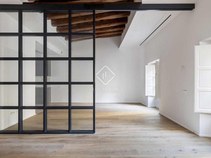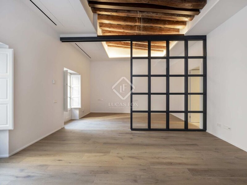 Lucas Fox presents the new build development Banys Vells, in a remodeled listed building located in the Born neighbourhood of Barcelona. The building is located in the walls of the old medieval baths, which is where it gets its name. The development has only five elegant apartments, as well as two commercial premises, so it enjoys great privacy. This 114 m² attic apartment is very spacious and could be joined to the second floor of the floor, if desired, making it even larger. The day area is presented in an open-plan space, with the living-dining room with the open-plan kitchen, with a total of about 52 m². The kitchen has a central island and comes equipped with appliances. The night area includes two bedrooms: a double bedroom and the main bedroom with a private bathroom with shower and built-in wardrobe . The property is completed with a second bathroom with a shower. During the remodeling, the most representative period elements have been maintained or restored such as exposed wooden beam ceilings, hydraulic tiles, brick walls and frescoes. All this gives an atmosphere of nobility to the property. However, these period elements have been combined, for total comfort, with modern equipment, such as a kitchen from the German brand Nolte with Siemens appliances , white Neolith Abu Dhabi countertops; and seamless bathrooms in matte light gray microcement, matte black ceramics, furniture and taps from Duravit. On the other hand, the property includes wooden windows and balconies with double glazing and shutters and underfloor heating powered by aerothermics. The development offers its residents a magnificent roof terrace for communal use, which comes equipped with a swimming pool, exterior kitchen, chill-out space, exterior shower with hot and cold water and a bathroom. From here, you can see the views of the old town of Barcelona, more specifically, some of the most beautiful churches in the area, such as Santa María del Mar. Finally, the development offers a lift that connects all floors and a lobby spacious with bicycle parking. Get in touch for more information.