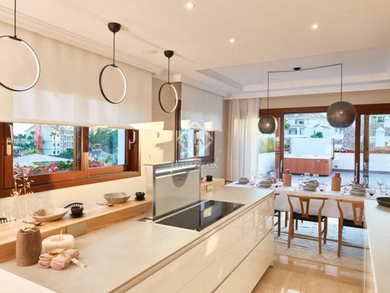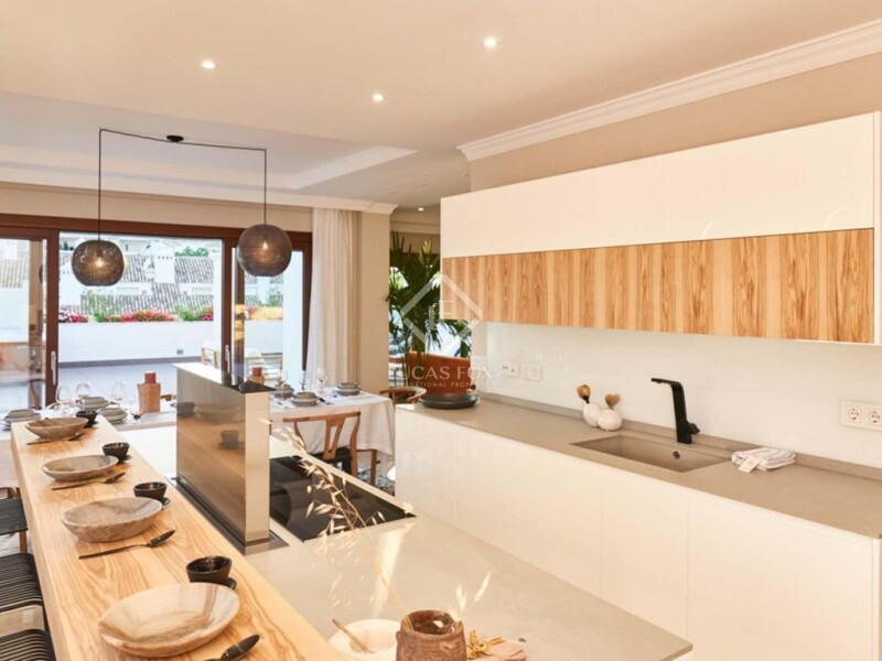 This exclusive luxury development of apartments and penthouses is located on the Golden Mile in one of Marbella´s premier spots. The complex of lush tropical gardens of 25,000m² offers amazing views of the Mediterranean. The spacious apartments are built to the highest specifications with; underfloor heating, central alarm, connections to TV FM radio and telephone in all the rooms, and fully equipped kitchens with top quality appliances. Large balconies and terraces provide spectacular sea views over the gardens. Every property comes with two parking spaces and a storage room. The apartment buildings are set in beautifully maintained and lush tropical gardens with mature trees, small pathways, outdoor pools, and small alcoves. The gardens are lit up at night-time and the gated community has security cameras located at strategic locations. On the lower floor of the penthouse we find the open-plan living room and the beautifully laid out Kitchen. One of the 3 bedrooms is on the lower floor, this is a generously sized bedroom with an ensuite bathroom. A second bathroom completes the lower floor. A staircase leads to the upper floor where we find the 2 remaining bedrooms, both with ensuite bathrooms and the main bedroom also with a small WC. The main bedroom has a small store room and also leads out to the loft where the amazing Mediterranean views await us.