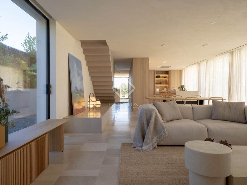 This exceptional house in Teià, is one of the stand-out properties in the area. Located on a south-facing plot, its 560 m² of constructed area fully maximises the inside-outside lifestyle the Maresme coast climate allows, and offers excellent views of the Mediterranean. Designed by OOAA architecture studio in a natural-toned color palette so that both interior and exterior lines seamlessly blend together to enjoy Mediterranean lifestyle throughout the year. The villa is laid-out over 3 levels, all connected by a lift. The ground floor features a wonderful open-plan, kitchen-living-dining room with direct access to a wide terrace with an infinity swimming pool, exterior bathroom and sunken chill-out area, perfect for entertaining. This level also has an office with ensuite bathroom, an entrance hall and a floating staircase up to the first floor. The upper level features a spacious main bedroom suite with dressing room, bathroom and a private terrace, a further double bedroom with ensuite bathroom, 2 more double bedrooms which share a bathroom, and another glass-fronted terrace with a jacuzzi, perfect for enjoying the fantastic views. The basement level has a 6-car garage, a gym with windows to a light well, a glass-walled wine cellar, an ensuite service bedroom plus storage and machine rooms. The house is fully automated with a top-of-the-range automation system, which controls the lighting, underfloor heating, air conditioning, sun protection, and security systems both inside and out. The landscaped garden is designed to integrate with the surroundings and with Mediterranean plants. The property is ideal for someone looking for a home built to the most recent and highest standards in a peaceful area and just 20 minutes from the centre of Barcelona. Delivery date Q2 2023 Please contact Lucas Fox for more details.