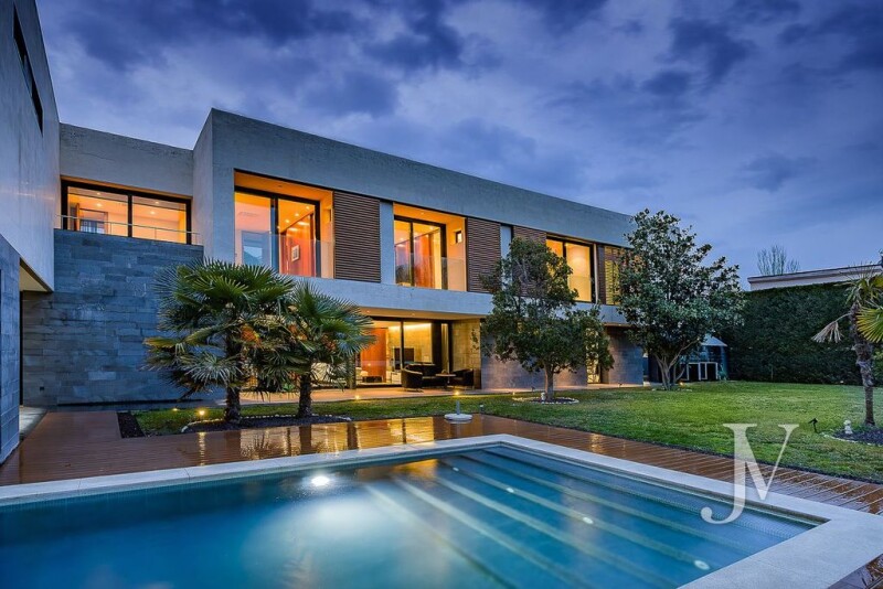 Villafranca del Castillo: Probably the house with the highest construction qualities in the area, it stands on a flat plot of 1,502. This impressive detached villa, built in 2010, recently improved and modernised, with 1223 m² of built area on three floors. General Features: · Three floors · 9 bedrooms (5 with en-suite bathroom) · 6 full bathrooms and 3 toilets · 3 spacious living rooms · Cinema room · Office · 2 kitchens (main and auxiliary) · Gym area · Laundry and drying terrace · Multiple storage rooms and pantry · 5 indoor and 1 outdoor parking spaces Gardens (main and one on each floor) Infinity pool in landscaped garden with automatic irrigation Floor Plan: Ground Floor: Spacious and bright entrance hall Imposing main living room Formal dining room Fully equipped main kitchen with Siemens appliances Cinema room with laser projector and 120-inch screen · Elegant office with private toilet · Guest toilet · Outdoor dining area with built-in barbecue First floor: · Master bedroom with large private terrace offering spectacular views, spacious and exquisitely designed dressing room, and en-suite bathroom with whirlpool bath · Three large bedrooms, each with dressing room, private terrace and en-suite bathroom · Additional living room · Equipped gym area Semi-basement floor: · Garage for 5 vehicles · Technical rooms for aerothermal energy and photovoltaic system · Spacious laundry room · Multiple storage rooms · Large pantry · Service room with full bathroom en suite · Large multipurpose room with auxiliary kitchen Outstanding Features: · Daikin aerothermal underfloor heating (hot/cold) · Daikin air conditioning in main rooms · Advanced home automation · 37 photovoltaic panels (20kW) with 20kW batteries · Security system with more than 30 sensors and cameras connected 24 hours a day to the ARC · Lift connecting the three floors Ethernet internet, TV and telephone in all the main rooms High-speed WiFi throughout the house Motorised blinds Central vacuum system In the garden there is a covered barbecue area, kitchenette and outdoor dining area enclosed by Lumon, so that the space can be used for more months of the year.