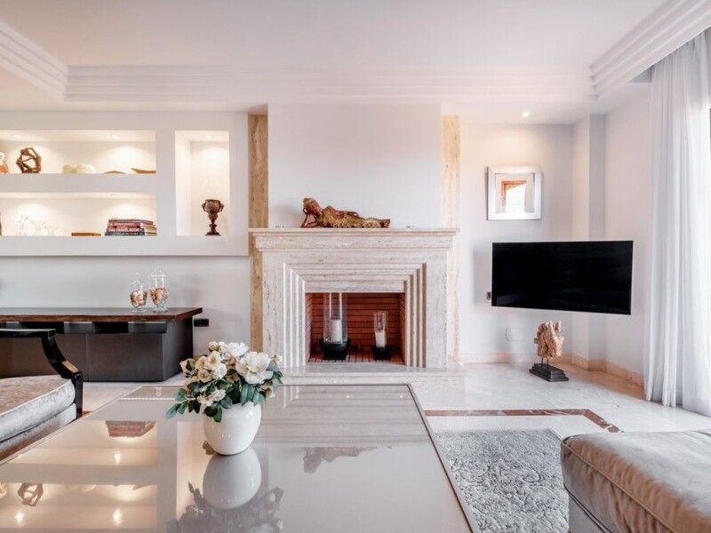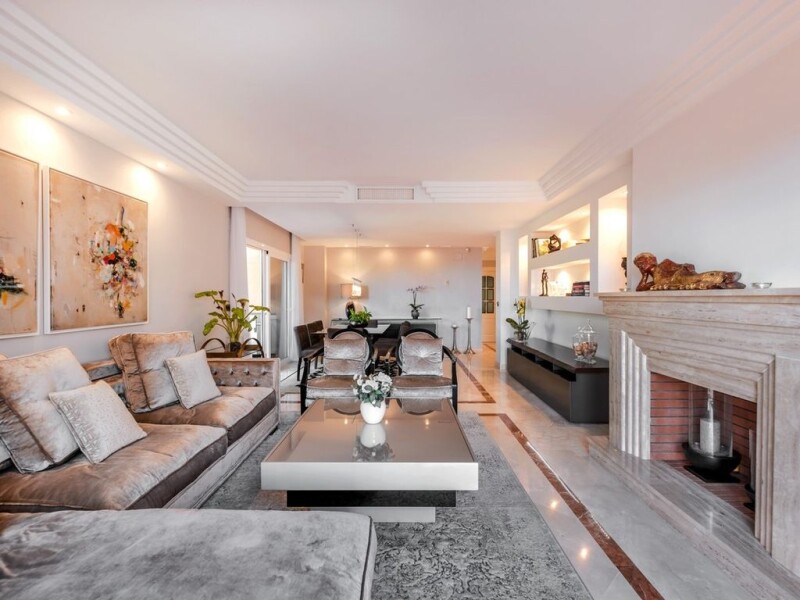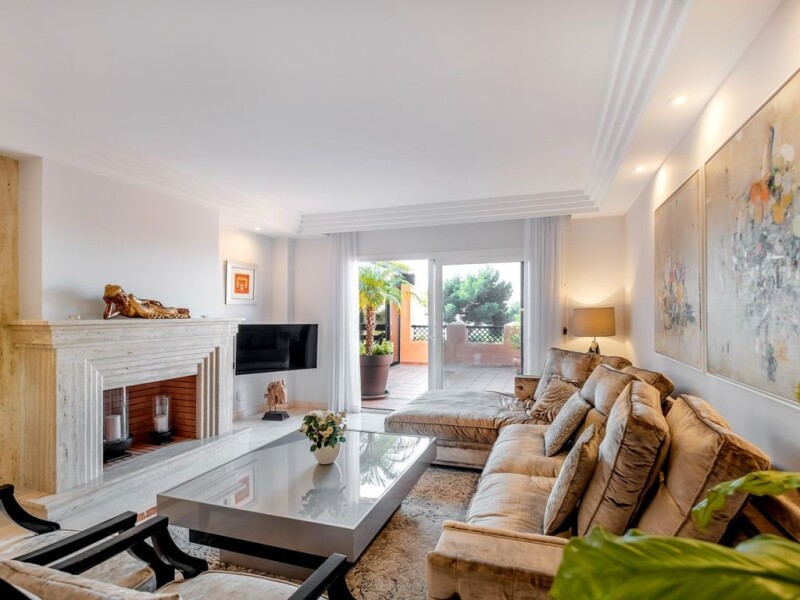 South facing penthouse with open sea views in Sierra Blanca, in an elegant urbanisation consisting of 42 apartments, at just 5 minutes drive to the center of Marbella, the beach and Puerto Banus, with concierge service and 24-hour security. It boasts the most beautiful gardens in the area with a communal lake swimming pool, heated indoor pool, Jacuzzi, Spa, sauna, Turkish bath and gym, as well as a social club with game and meeting room. The spacious 2 bedroom penthouse has large covered and uncovered terraces enjoying beautiful views overlooking the communal areas and partial sea views; offers 2 bedrooms each with its own bathroom and one additional toilet; large living room with a closed marble fireplace and dining room with access to the terraces which can be accessed from both sides; fully equipped kitchen with separate laundry area. All rooms have underfloor heating, A / C and heat pump, alarm, pre-installation Bang-Olufsen, hot tub for two in the master bedroom plus two large parking spaces and storage room.