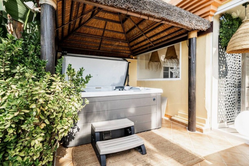 Redesigned corner garden apartment in a gated community in Nueva Andalucia, with 180° panoramic views of both sea and mountains and his own gated private courtyard. Spacious double-width living room with distinct zones tailored for both leisure and work. Stylish sitting area, TV wall, fireplace, 2-desk work-from-home office, additional sitting area, and a mini-wine cellar. The contemporary indoor/outdoor kitchen, surrounded by full-height glass curtains, extends to two separate dining areas and a spacious terrace seating area. Bali-style gazebo housing a Jacuzzi. Gardens surrounded with mature tropical plants. Three double bedrooms, each with its own en-suite bathroom. The master bedroom also has a walk-in wardrobe. Throughout the space, all materials and furnishings have been tastefully selected, creating a comfortable and stylish home with modern amenities and a beautiful ambiance. Set within a gated community, close to Puerto Banus and nearby beaches, and with easy access to Marbella, San Pedro, Golf Valley, leading international schools and sporting facilities. An idyllic lifestyle choice – perfect as a permanent home, holiday retreat, or a lucrative rental investment.