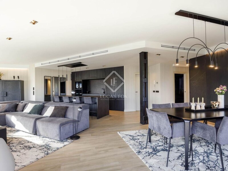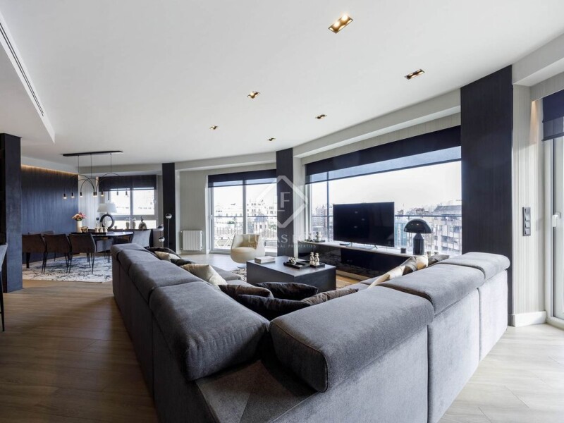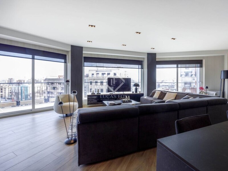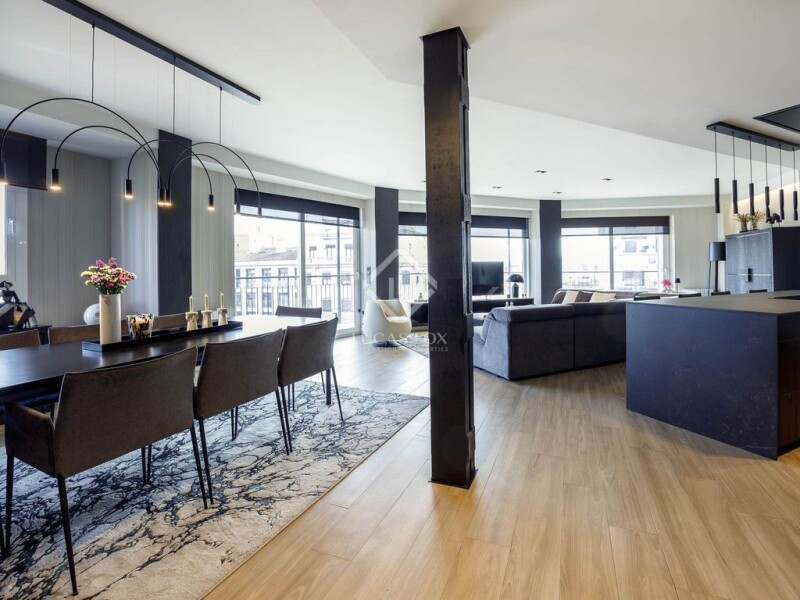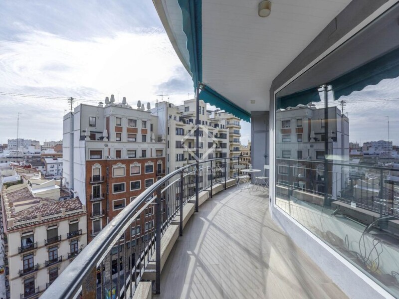 This apartment is located on the top floor of an emblematic building in the centre of Valencia, strategically located next to the Town Hall Square and close to Calle Colón. La Finca has a daytime concierge service and 24-hour security and the property has a parking space with direct access from the building. The property has recently been completely renovated , with top quality materials and a practical and functional design. We enter through a practical entrance hall and on the right hand side, we find the main bedroom, with a large dressing area and private bathroom. Next, we have two double bedrooms, of large dimensions, both with large windows facing the façade, so they receive plenty of natural light. They have a large closet area and enough space to have a study area, with a large table. A full bathroom , of generous dimensions, serves them. In addition, the property has a practical independent study or study , ideal for working or using as a reading area. The living-dining room area, completely exterior and of very large dimensions, has large floor-to-ceiling windows and offers access to an incredible terrace with impressive unobstructed views. The kitchen is open to the living room, with a large central island with the cooking area and a large dark-coloured cupboard, with all the high-end appliances integrated. It has a practical separate utility room area. The property includes porcelain floors, hot/cold air conditioning through ducts, individual gas heating through radiators, exterior carpentry with thermal and acoustic insulation and interior carpentry in natural wood. Please contact for more information.