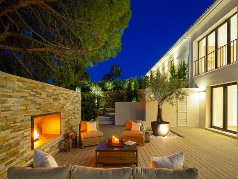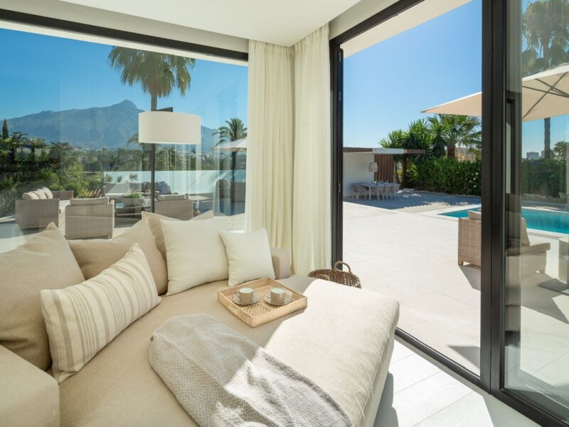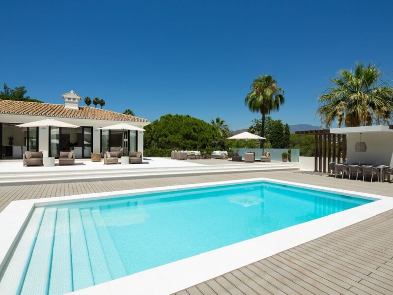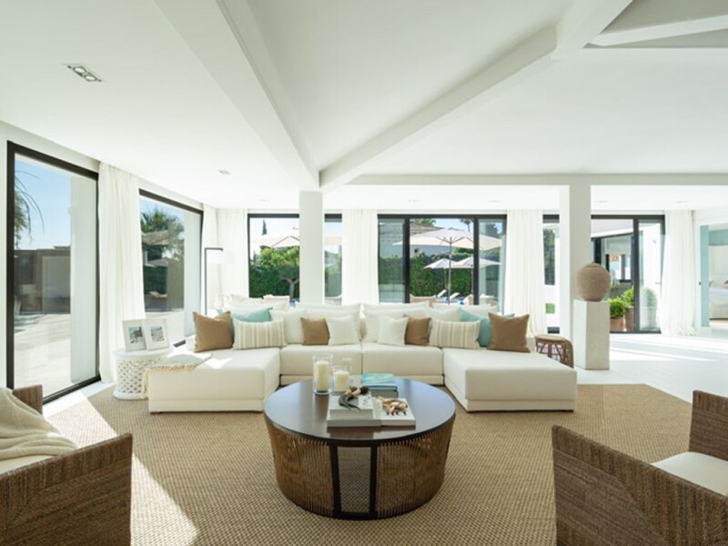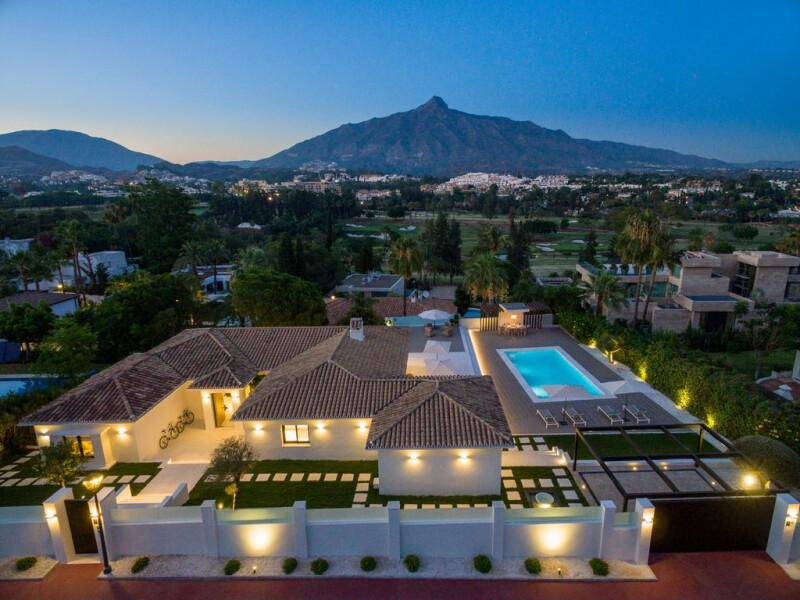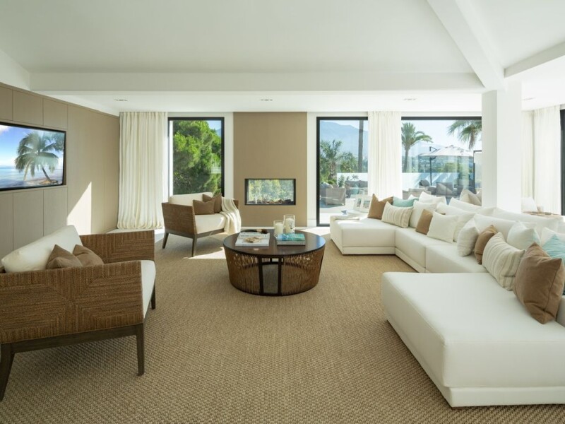 Completely renovated villa in Las Brisas with spectacular views of La Concha. Villa Estrella is a modern bungalow-style villa, exquisitely decorated with attention to detail. The villa offers 5 en- suite bedrooms and a stunning outdoor pool area with multiple seating areas and a spacious turquoise pool. Villa Estrella boasts spectacular views from its south-east facing pool area, outdoor garden area with a cozy fireplace and lounging area. In the lower level the villa features a gym, bar and TV room making this space a perfect spot for entertainment and relaxation. The villa is located in a quiet residential area and surrounded by the most prestigious golf courses of the Costa del Sol. Villa Estrella is situated in the heart of the Golf Valley, within short distance to all amenities, restaurants and the beach. This is the perfect opportunity to acquire a cozy and charming modern villa in a prime location in Marbella.