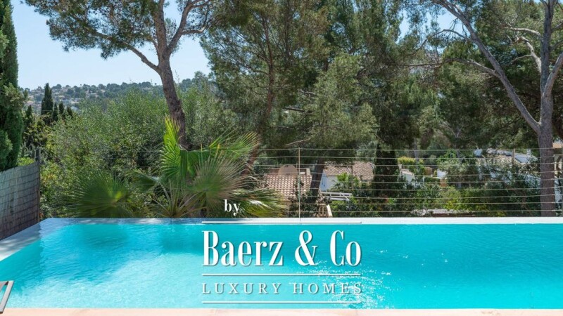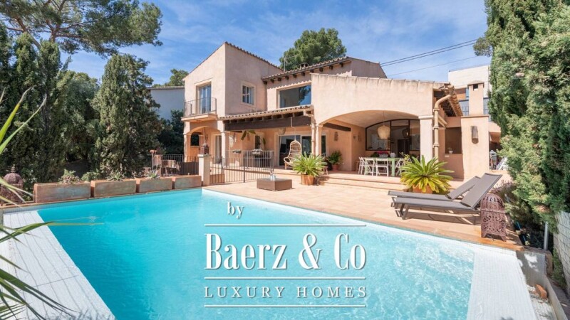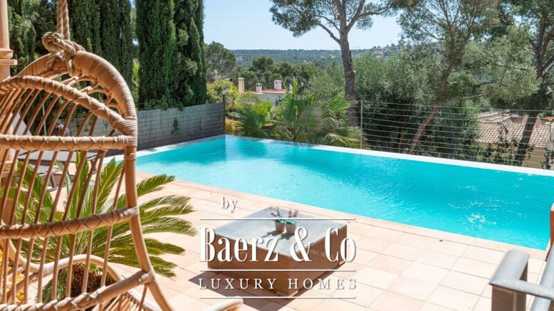 This magnificent villa is situated in a quiet and sought-after location in Santa Ponsa in the south-west of the island. The living space of approx. 243 m² is distributed over 2 floors. On the first floor of the house there is an open-plan living and dining area with fireplace, a fully equipped Mediterranean kitchen, a storage room and two bedrooms as well as a bathroom. The upper floor consists of the spacious master area with dressing room and bathroom en suite as well as a private terrace. From the living area, you have access to the partly covered terrace and the pool area with sun terrace, outdoor shower, BBQ and a cozy lounge that invites you to relax. A large garage with space for up to 3 vehicles and the technical room in the basement as well as 2 further outdoor parking spaces complete this offer. The golf courses of Santa Ponsa can be reached in a few minutes. - Turkish steam bath - ceiling beams - Quiet location & privacy and much more. Santa Ponsa is located in the exclusive southwest of Mallorca and is considered one of the most sought-after places on the island. With its three golf courses (Santa Ponsa Golf I, II and III), Santa Ponsa is particularly popular with golfers. In addition to a small bay, Santa Ponsa also has a fantastic, extensive sandy beach with a length of approx. 600 meters, which is lined by a wonderful beach promenade. Here you will find a variety of restaurants, bars and cafés as well as various shopping facilities. The exclusive marina of Port Adriano can also be reached in just a few minutes by car. There are several exquisite places to eat here, such as Sansibar Wine, La Terraza and Trattoria Vino del Mar, to name but a few.