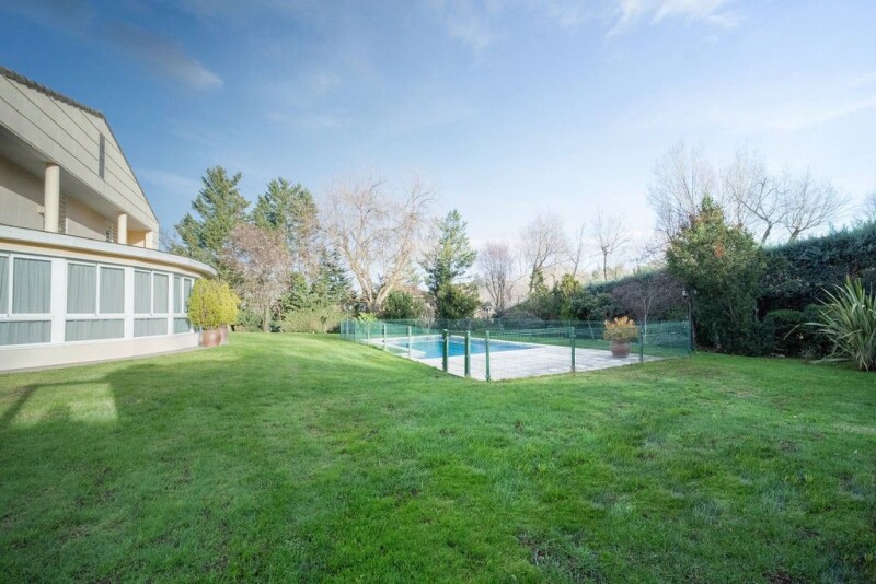 Fantastic villa located in La Moraleja, a luxury residential housing development located north of Madrid 10 km from downtown and 10 minutes from Adolfo Suarez Airport. It has been recently renovated south facing in a great plot very well located with swimming pool and tennis court. Impeccable recently renovated detached villa of 600 m2 built (550 useful approx.) on a completely flat plot of about 2200 square meters that is characterized by the following super comfortable distribution: Entrance floor: entrance hall with spectacular living room in two environments the main one with a semicircular surface and another with fireplace, guest toilet, office, a large dining room, guest bedroom en suite, and the kitchen area, which has a large hallway with storage area, service bedroom with bathroom, laundry area and access to the indoor garage with capacity for two cars and another outdoor parking space. From the dining room, there is access to the enclosed porch where there is a living/dining area also with a circular floor plan from which you can access the wonderful garden where we find a swimming pool, tennis court, and a porch. Upper floor: we find a large central living room with lots of light in which around the four bedrooms are distributed en suite, all of the very good size and with renovated bathrooms, the main one with a sitting area and dressing room. It has a basement floor currently not enabled. The plot is very well located, near the shopping center and public transport, with access to the Alcobendas promenade from the garden. It has oil heating with radiators and an alarm.