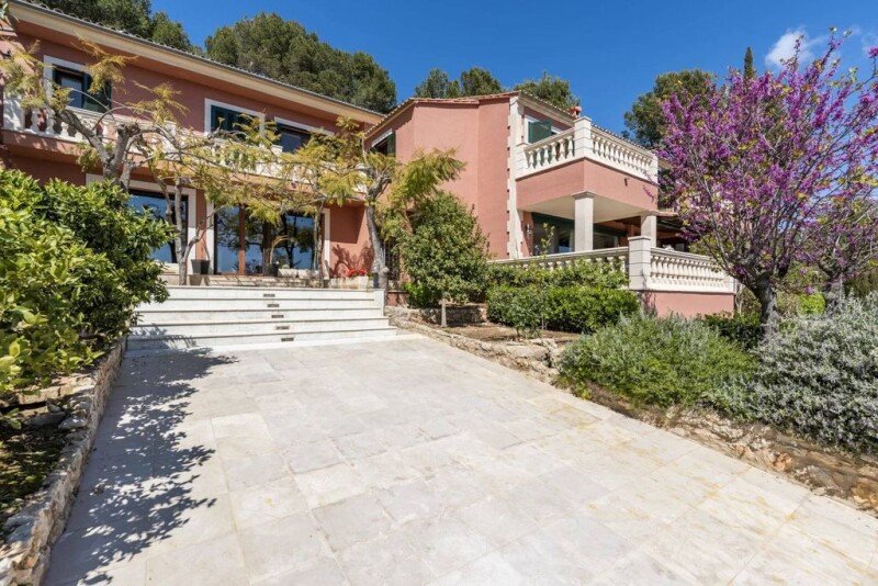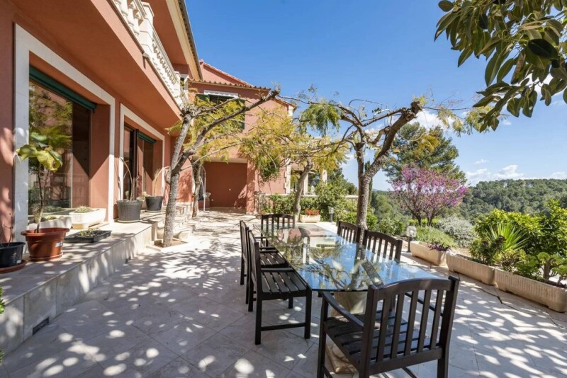 Villa located in absolute tranquillity in Palma on a sloping position in a nature-protection area, with enchanting sea views as far as the bay of Palma. The 627 sq.m south facing house is accessed via 2 wide driveways and comprises a large living/dining room with an open kitchen, a wine cellar, 5 bedrooms and 5 bathrooms. A particular feature is that all bedrooms have access to a terrace with breathtaking views. The villa is set on a plot of 15000 sq.m of which 4000 sq.m are green and planted with various kinds of fruit trees including apricots, apples, pomegranates, avocados, figs, sloes, walnuts and peaches. The plot is surrounded by wooded countryside and the garden also benefits from terraces, a swimming pool and a bbq with industrial kitchen. Other features include marble floors, underfloor heating, air conditioning, automatic irrigation system, water-recycling system and decalcifier, automatic external lighting and garage.