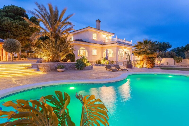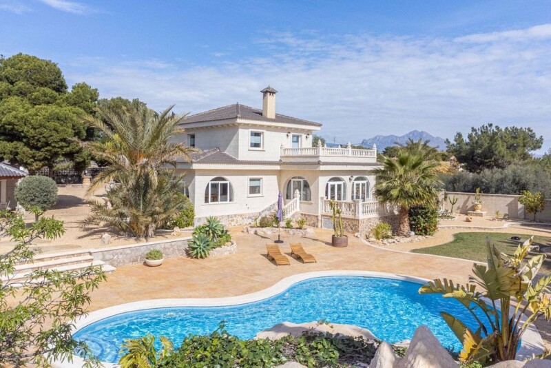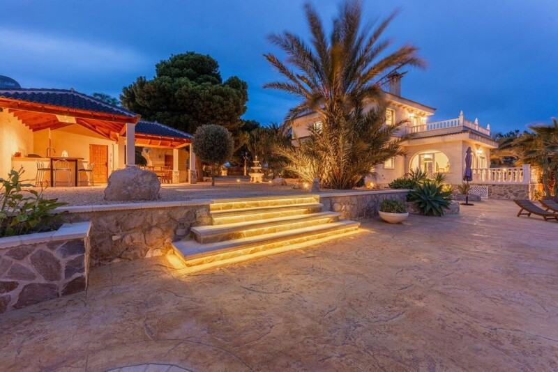 Luxurious Mediterranean Villa in Mutxamel, Alicante Villa Paradis, a stunning villa in Mutxamel, Alicante, is an exceptional property built and appointed to the highest standards. Set on a spacious flat 2,050 sqm plot, this residence offers a perfect blend of elegance, comfort, and functionality. The main house boasts approximately 170 sqm of living space, with two solariums that offer breathtaking views. The upper floor features two spacious bedrooms, each with its own bathroom and a walk-in closet, leading to a private solarium. The ground floor includes a versatile room (ideal as an office or additional bedroom), a bathroom, a utility room, and a large open-plan living area with a fireplace, dining space, and a kitchen area with an island and breakfast area and fully equipped with appliances. Adding to the charm of this property is a 44 sqm guest house with an outdoor kitchen, perfect for visitors or entertaining. A double garage and two carports (70 sqm) provide ample parking. The outdoor spaces are simply spectacular. The 70 sqm swimming pool, complete with a waterfall and a decorative cave, creates a private oasis, while the beautifully landscaped gardens feature a petanque court, natural grass, a fountain, and extensive indirect lighting. The property also includes an outdoor bathroom (15 sqm) with a shower, WC, and sink, as well as a 10 sqm garden house for extra storage. Villa Paradis is equally breathtaking by night as it is by the day. Every detail of this villa exudes quality, from the stucco decorations throughout the home, guest house, and garages, to the air conditioning in all rooms and an automatic irrigation system ensuring the gardens remain lush year-round. Prime Location Located in Mutxamel, just 20 minutes from Alicante, this villa offers the perfect combination of privacy and convenience. The international airport is a short drive away (23 minutes), as are prestigious golf courses (12 minutes), stunning beaches (16 minutes), and lively marinas. Whether you are seeking a permanent residence or a luxurious holiday retreat, this villa is faultless in every way. This is a rare opportunity to own a dream home in one of the most sought-after regions of the Costa Blanca.
