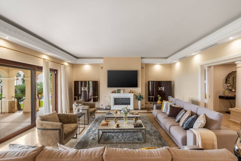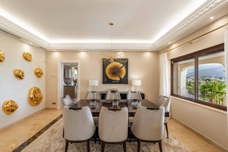 Elegant Mediterranean villa in Paraiso Alto, Benahavis Nestled in the prestigious enclave of Paraiso Alto, this exquisite villa blends classic charm with contemporary elegance. Originally built in 2002 and meticulously renovated in 2019, it offers 965 m² of refined living space across three levels. The home enjoys breathtaking sea views, which can be admired from multiple terraces and sun-drenched rooms, creating a serene and luxurious ambiance. Designed for comfort and privacy, the villa boasts 11 bedrooms and 12 bathrooms, including a separate guest apartment and staff quarters. The main living area flows seamlessly into a covered terrace, overlooking beautifully landscaped gardens and a private heated pool, perfect for year-round enjoyment. A round tower houses a modern kitchen with panoramic windows, flooding the space with natural light. The upper floor features additional bedrooms, all with en-suite bathrooms and access to a wraparound terrace, while the tower’s top level offers a cozy lounge or office space. A true sanctuary for refined living, the villa comes fully furnished and is equipped with underfloor heating, air conditioning, and a private wine cellar. Set within a tranquil yet accessible location, it is minutes from golf courses, fine dining, and the coastline, making it an exceptional choice for those seeking a luxurious retreat in the heart of Benahavis.