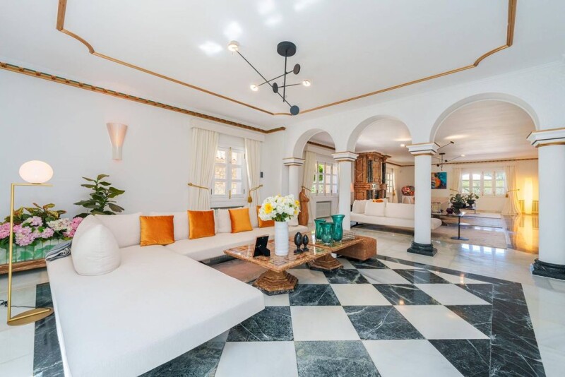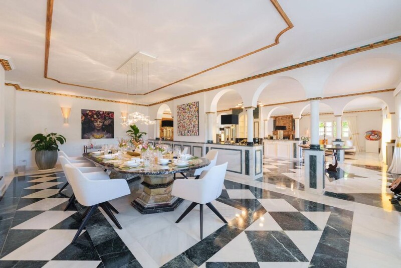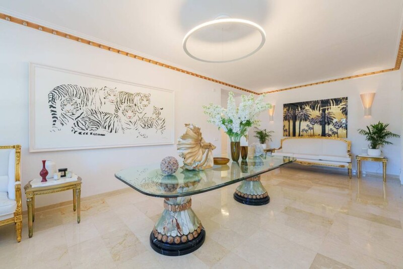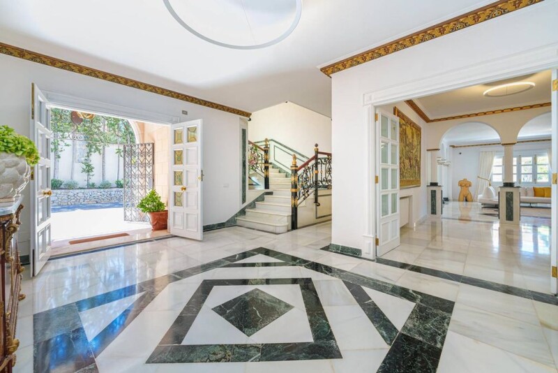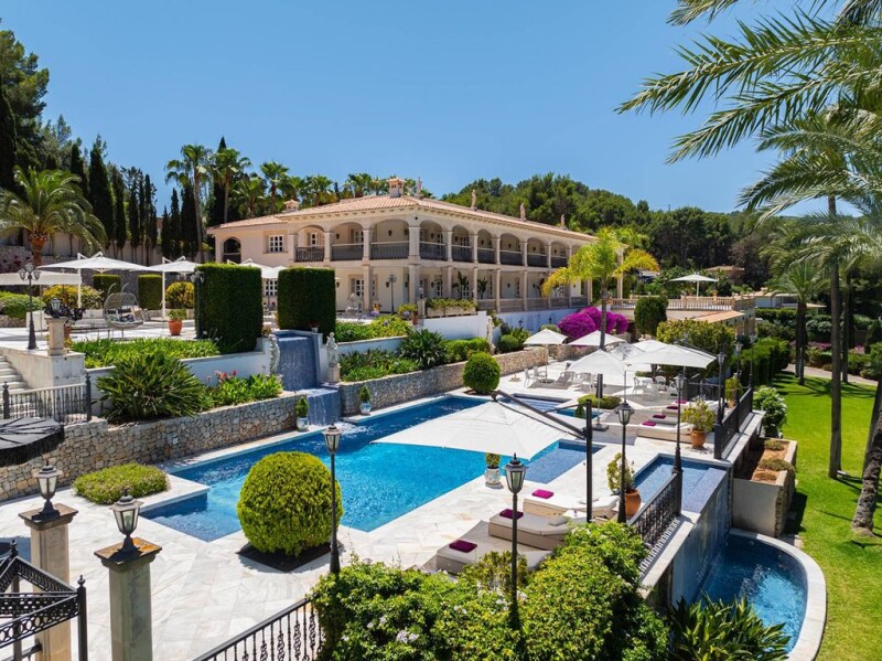 This property is characterized by the extraordinary entrance door with amphorae and numerous statues. The property has a plot of approx. 9,000m2 and enjoys unparalleled privacy due to its location on the hillside overlooking the mountains and the golf course. Son Vida is a luxurious residential area just 10 minutes from the old town of Palma. In 2023, the manor property was equipped with the latest mobile technology - including the electrolade solar station. This two-story property with over 20 covered arches and 600m2 of covered terraces invites you to take a stroll in any weather. Several fountains, surrounded by amphorae and waterfalls surrounded by ancient statues, characterize the entire property. The tennis court and separate gym, as well as a spa with jacuzzi and steam sauna, offer a variety of sporting and relaxing activities. The impressive landscape of the large pool with reverse current system and two waterfalls with spacious sunbathing areas and plenty of sun loungers is a summer highlight. The bar Linny's and the large fireplace allow for enjoyable meals with friends and family at any time of the year. The central gas/water heating system can also run electrically and/or be supplemented with the new air conditioning system. There are 9 spacious bedrooms with en-suite bathrooms in the main front house and 5 more bedrooms with bathrooms in the side building. Overall, Castello M has approx. 2,900 m2 of living space with 4 garages, 6 outdoor parking spaces, and an electric charging station.