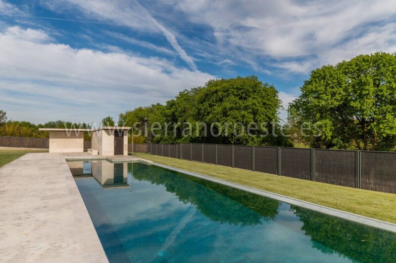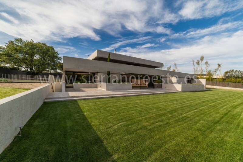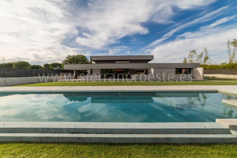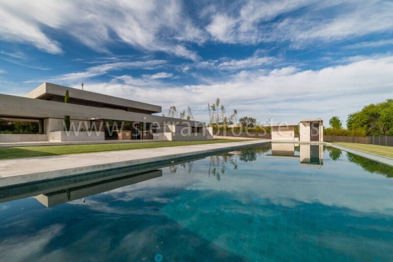 Spectacular newly built home in the best area of La Finca, on Paseo de los Lagos. On a plot of 3,000 m2, the house has a constructed area of 1,500 m2. Bright, modern, built with the highest quality of construction materials, it has a polished exposed concrete facade, with natural Campaspero stone and Oregon pine wood slats on facades and exterior false ceilings. And a garden roof (vegetable hydropack) with automatic irrigation. It is distributed over 2 floors and a semi-basement. On the ground floor is the entrance hall or lobby, the living room with beautiful and careful interior lighting and large windows with fireplace and exit to the outside. We also find on this floor the dining room, the kitchen with a pantry and Gaggenau furniture with Würth equipment and shot-blasted steel and Corian countertops. The ground floor is completed by 3 bedrooms, all en suite with bathroom. On the upper floor is the master bedroom with a living room, 2 dressing rooms and 2 full bathrooms and a study. And in the basement there is the indoor garage (3/4 spaces) with charging socket for electric vehicles, multipurpose room, gym, yoga room, heated indoor pool, sauna, Turkish bath, changing room and toilet. Also the service area (2 bedrooms and 2 bathrooms) and the facilities room and a storage room. All rooms have natural wood doors, as do the closet doors, except the kitchen, which has an automatic glass door. It has LED lighting throughout the house and home automation (programmable). The air conditioning is by installing geothermal energy (8 holes 15 meters deep) and a radiant-cooling ceiling. Finally, it has an elevator and dumbwaiter. WIFI installation throughout the house. Outdoor parking area for 6 cars. Garden, swimming pool and changing rooms. And nice views. To enter to live. La Finca is the most secure urbanization in Spain and Europe.