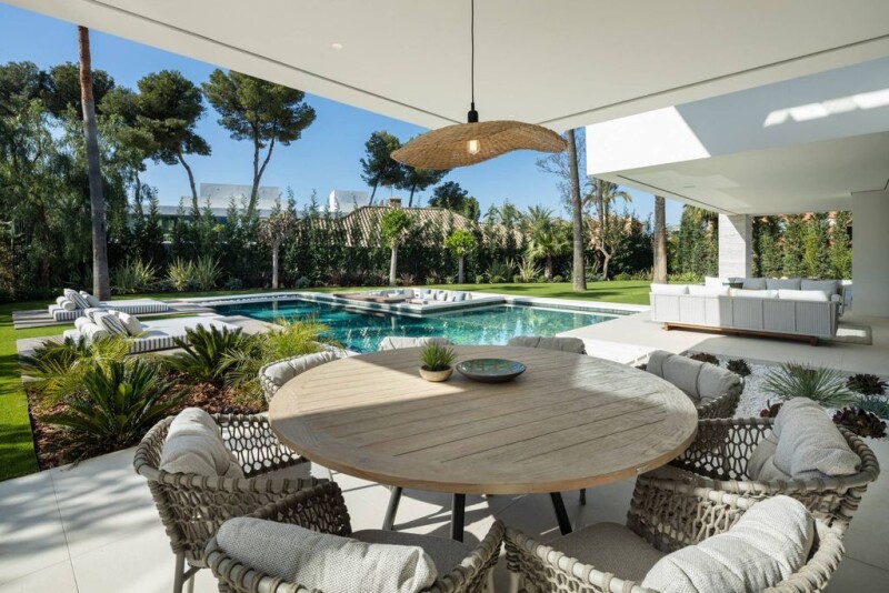 Modern and spacious luxury Villa in Atalaya Rio Verde, Nueva Andalucia, Marbella Welcome to a striking modern villa located in the prestigious Atalaya Rio Verde, Nueva Andalucía. Designed by renowned architect Carlos Lamas, this villa offers an impressive combination of contemporary design and luxurious living. From the stunning facade to the grand entrance adorned with a water feature, every detail is carefully crafted to create an atmosphere of refinement. Situated on a spacious plot, the villa is surrounded by beautifully landscaped gardens that provide a tranquil retreat. The outdoor spaces are designed for relaxation and entertainment, featuring large terraces perfect for alfresco dining, an outdoor kitchenette, a BBQ area, and a private pool complete with a sunken chill-out zone. Inside, the villa boasts floor-to-ceiling glass doors that flood the open-plan living, dining, and kitchen area with natural light. The sophisticated interior design is complemented by a bespoke kitchen with high-end appliances and stylish wooden cabinetry, offering both functionality and aesthetic appeal. The ground floor also includes a guest bedroom with terrace access. On the upper level, the master suite is a true highlight, featuring a walk-in closet, an elegant beauty station, and a luxurious bathroom with a standalone bathtub and walk-in shower. Additional guest suites on this floor offer privacy and comfort, each with terrace access. The lower level is dedicated to leisure and wellness, featuring a home gym, sauna, wine bodega, and an entertainment room with a custom bar. A spacious garage completes this extraordinary property. This villa is ideally located close to international schools, renowned golf courses, Puerto Banús, and the Golden Mile, offering easy access to world-class dining, shopping, and entertainment. This villa is perfect for those seeking luxury living in Nueva Andalucia (Marbella).