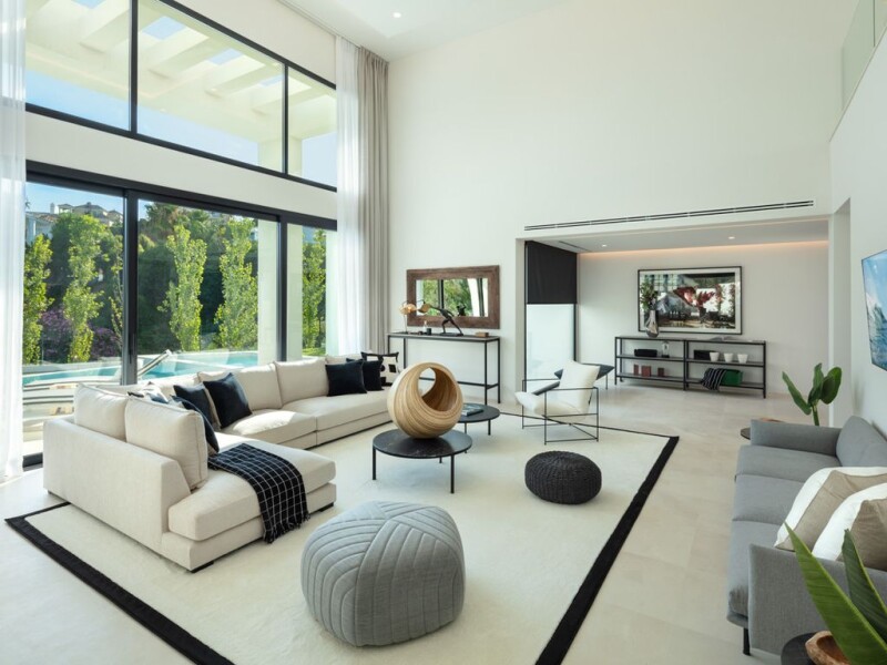 Brand New Contemporary villa for sale in Nueva Andalucia Brand new villa in the sought after community in the heart of the Golf Valley. This impressive villa has been designed to combine high end modern finishes with comfortable every day living. It has large windows to attract light. State of the art villa in the very best address in Nueva Andalucia. FLOORS • Interior: limestone marble in 60 x 60 cm tiles / matt fi nish. • Exteriors: limestone anti slippery 60 x 60 cm / matt fi nish. • Pool: marble border anti slippery / matt fi nish. BATHROOM WALL TILES • Zamora marble / matt fi nish / only shower and bath tube area. SANITARYWARE AND FAUCETS • Sanitaryware: Villeroy and Boch / Royo. • Faucets: Royo, Hans Grohe Cristina faucets for bathtubs, showers and basin. INSTALLATIONS • Underfl oor heating (electric cable for bathrooms). • Air condition: Technivel. • Hot water: heating Pump LG Thermal. • Ventilation: Soler y Palau. • Electricity mechanisms: Bticino Living light. Quality Specifi cations EXTERIOR CARPENTRY • Entrance door: Solid wood entrance door. • Sliding balcony doors: Aluminium sliding doors with double glazing. • Windows and hinged balcony doors: Aluminium windows with double glazing. INTERIOR CARPENTRY • Interior doors: painted MDF doors / hidden hinges. • Closets: painted MDF doors. • Interior of clostes equipped with set of drawers, shoe bars and hanging bars. • Skirtings: limestone skirting boards. POOL • Finished with 2,5 x 2,5 cm mosaic tiles. KITCHEN: • Fully fi tted kitchen with Siemens appliances.