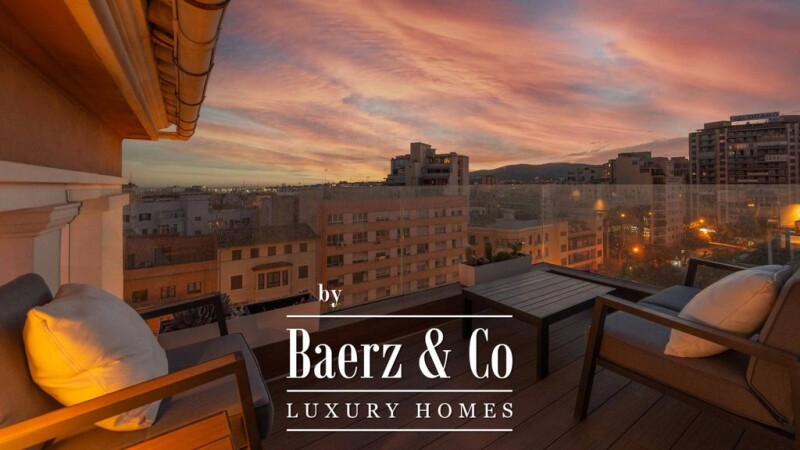 This unique duplex penthouse in Palma has fantastic views and was completely renovated in 2021. Only high quality materials were used to provide maximum comfort. The property is spread over two floors and offers an individual lighting concept as well as a spacious roof terrace with outdoor dining area, and a chill-out lounge to enjoy the stunning sunsets and sunrises. The lower floor offers two bedrooms with en suite bathrooms, a guest toilet and access to the terrace. On the upper floor is the open and light-flooded living and dining area with adjoining and fully equipped kitchen, which leaves nothing to be desired. From this level you can reach the roof terrace via a stylish spiral staircase from which you can admire a 360° view. The luxurious Palma Penthouse is sold fully furnished. Two garage spaces complete this offer. - Domotics system - fully furnished - Wooden beam ceilings - High tech lighting and much more. Palma de Mallorca is the cultural capital of Mallorca and one of the most interesting cities in Europe. Especially the bay of Palma with its numerous luxury yachts, restaurants and clubs, the harbor for the huge cruise ships, the impressive cathedral La Seu and the historic city of Palma with its many churches attract millions of tourists every year. Very popular are apartments and penthouses with sea view in the old town of Palma, the so-called Calatrava or Casco Antiguo, on the promenade Paseo Maritimo or in the former fishing district Portixol. Luxurious villas can be found in the exclusive area above Palma, in Son Vida, but also in Bonanova, Portals, Genova or in Bendinat, very close to the Royal Palace of Marivent. The city of Palma has an extensive cultural offer, an excellent infrastructure and good international private schools, all located in and around Palma. The proximity to the airport "Aeropuerto de Son San Juan" makes the purchase of a property in or near Palma particularly attractive for buyers from all over Europe.