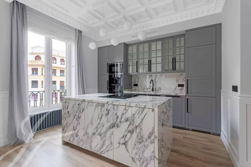A newly renovated apartment located on the fifth floor of a beautiful building with a classic facade. Thanks to its southeast orientation it has excellent natural light which, together with the good ceiling height and meticulous renovation, make it a very pleasant property. The exterior area is occupied by the large living room with balconies overlooking Alcalá street, with the modern style kitchen, a large island and equipped with high-end appliances. The property has three generously sized bedrooms. All have large fitted closets and one of them is exterior. There are three full bathrooms (two en suite) and a laundry room. A storage room is also included. This fantastic apartment is equipped with electric blinds and ducted air conditioning with independent temperature control in each room. Excellently located in the neighborhood of Salamanca is certainly an excellent opportunity both as an investment and to enjoy the best location in Madrid.