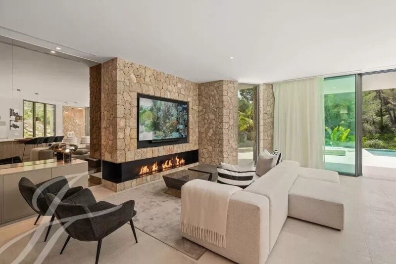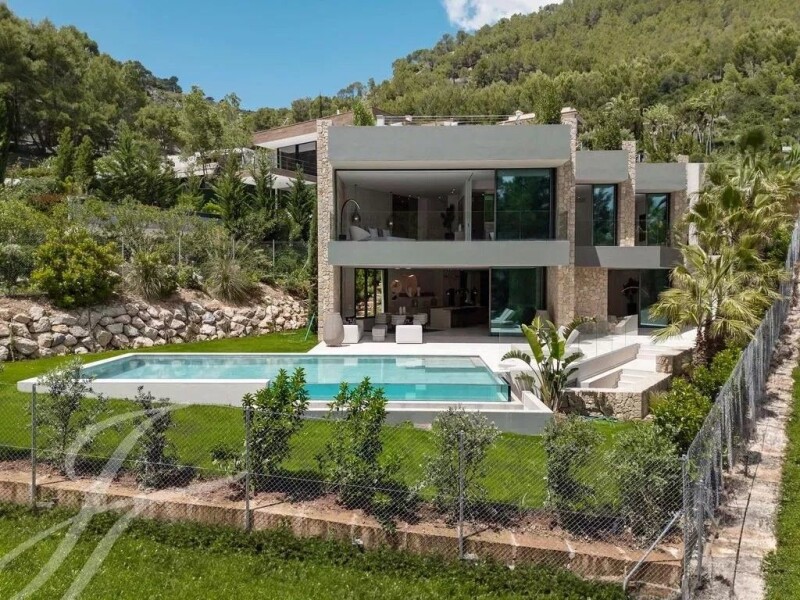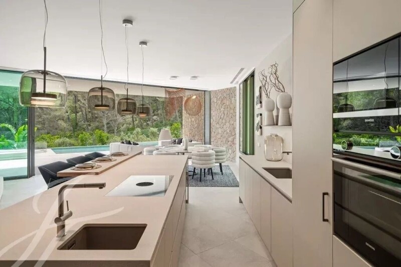 The new built villa in Son Vida is truly a sight to behold! The views to the forest offer a perfect balance of modern luxury and natural beauty. Sprawled across an expansive plot of 1.160 square meters, this magnificent villa boasts a built-up area of 462 square meters, which is divided into three levels. As you approach the villa, a double garage with space for two vehicles greets you. A convenient lift or staircase connects the garage to the main living areas. The ground floor is dedicated to the open-plan living and entertaining areas. The spacious living room, with its generous use of natural light, flows seamlessly onto the expansive terraces and the infinity pool. The sleek, modern kitchen overlooks the pool and the green zone beyond, inviting you to cook and dine alfresco. There's also a guest bedroom with an en-suite bathroom and dressing room on this level. On the upper floor, you'll find the master bedroom, complete with a walk-in closet and an en-suite bathroom, as well as two additional double bedrooms with en-suite bathrooms. Each of the bedrooms enjoys stunning views of the forest and the pool. The crowning jewel of the villa is the rooftop terrace with beautiful views to Palma city. Here, you'll find a barbecue area, lounge area, and a fireplace making it the perfect setting for dining and entertaining. The villa is equipped with underfloor heating and air conditioning, ensuring comfort all year round. The marble floors, natural stone walls, and design lighting throughout the villa create a modern and sophisticated ambiance. The location of this villa in Son Vida couldn't be more perfect. Surrounded by lush greenery and boasting views of Palma city, it offers the best of both worlds: peace and tranquility, as well as easy access to the vibrant city center.