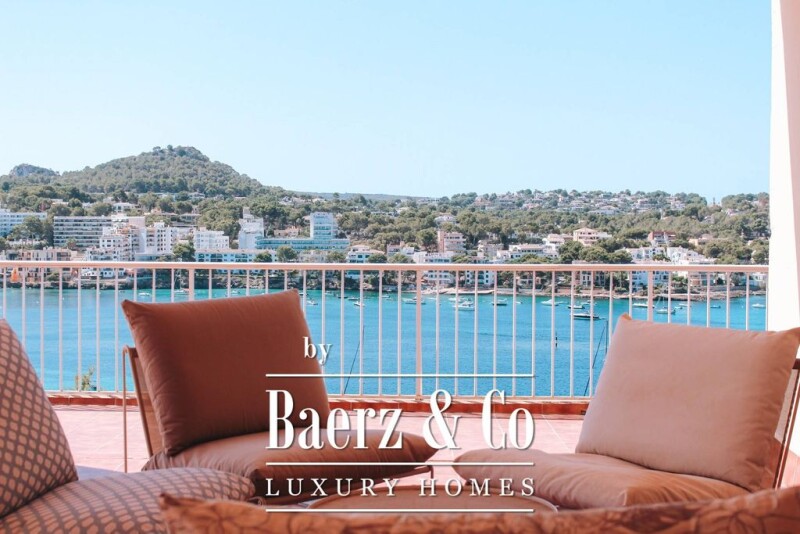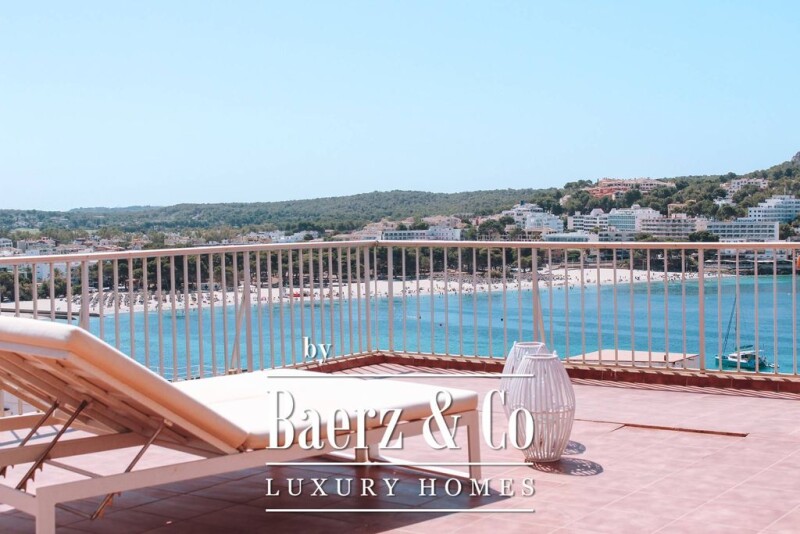 This penthouse with sensational panoramic sea views, is very centrally located in 2 sea line of Santa Ponsa. There are several amenities in the immediate vicinity and the beach is within walking distance. The penthouse itself is located on the 6th floor of a very well maintained complex. The property offers a living area of approx. 110 m² and is divided into a living/dining area, a closed kitchen, 3 bedrooms and 2 bathrooms. The highlight of this penthouse apartment is the partly covered terrace with a size of 375 m². There is already a planned renovation project for this penthouse that could be taken over. - Gas central heating (prepared) - Community pool - Aluminum windows (2022) - Fireplace with wood paneling and much more. Santa Ponsa is located in the exclusive southwest of Mallorca and is considered one of the most desirable places on the island. With its three golf courses (Santa Ponsa Golf I, II and III), Santa Ponsa is especially popular with golfers. In addition to a small bay, Santa Ponsa also has a wonderful, extensive sandy beach with a length of approx. 600 metres, which is lined by a wonderful beach promenade. Here you will find a large number of restaurants, bars and cafés as well as various shopping facilities for young and old. The beach is particularly popular with families with children, as it slopes gently into the sea and there are very few high waves. The exclusive marina of Port Adriano, which was newly opened in 2012, can also be reached in just a few minutes by car. There are several exquisite restaurants here, such as Sansibar Wine, La Terraza and Trattoria Vino del Mar, to name but a few.
