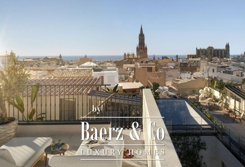 This outstanding three-bedroom, three-bathroom duplex is distributed over the top two floors of the building and includes a sensational roof terrace with far-reaching views over the city’s rooftops. On the lower level a large, light-filled living room with antique floor tiles and exposed wooden beams is located at the front of the building, with two balconies overlooking the street. To the rear are two spacious bedrooms with ensuite bathrooms. The master bedroom features windows into the central patio, built-in wardrobes and Mallorquin tiles on the floors, while the second bedroom has glass-panelled doors to allow light in from the patio. Both bathrooms are luxuriously finished in Volakas marble and walnut wood and feature walk-in showers and double vanities with integrated marble sinks. On the upper level, an open concept kitchen, dining and living room wrap around two sides of the central patio. Full height windows facing the courtyard and a light well at the rear bathe this space in natural light. The sleek kitchen, finished in walnut wood with a marble-topped island and integrated sink, is equipped with top-quality Gaggenau appliances, including a wine fridge. Also on this level is a large third bedroom with a sloping ceiling, an ensuite shower room, and a storage room. Volakas marble floors with a wood trim and exposed wooden beams extend throughout this level, lending it timeless, elegant appeal. From here, stairs lead up to a sunny, 76 m2 terrace with sweeping views of Santa Eulalia church, the Cathedral and the Bellver Castle. Spread over varying levels, this is a privileged place to soak up the sun on winter days and enjoy warm summer nights high above the bustle of the city. Die lebendige Inselhauptstadt Palma wurde 2015 vom Times Magazine, zum lebenswertesten Ort der Welt gewählt. Hierbei setzte sie sich gegen starke Konkurrenz wie Toronto, Auckland oder Berlin durch. Die Bewohner genießen hier gern die vielen Sonnentage und die stilvolle Altstadt. Eine Menge der Altbauten sind gut erhalten und tragen somit zu dem ursprünglichen Charme der Balearen Hauptstadt bei. Ein umfassendes Freizeitangebot vom Theater über die Oper bis hin zu einigen Museen und ein großartiges Nachtleben tragen dazu bei, dass Palma so liebens- bzw. lebenswert ist. Die geografischen Gegebenheiten sind mit dem Meer vor der Haustür und den Bergen in der unmittelbaren Umgebung nahezu traumhaft. Diese einzigartige Altstadtimmobilie liegt in einem der begehrtesten Viertel von Palma, dem Calatraval Viertel. Ganz in der Nähe der Kathedrale oder dem Almudaina Palast.