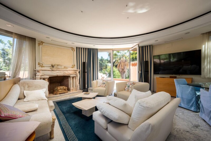 Gorgeous mansion for sale in the heart of the Golden Mile, Marbella Discover this Mediterranean-inspired estate nestled within the prestigious residential enclave of Nagüeles, enveloped by lush sub-tropical gardens within impeccably manicured grounds. Set against the iconic La Concha mountain backdrop and offering glimpses of the sea, this sophisticated residence beckons you through a captivating courtyard entrance featuring a graceful fountain centerpiece, ample guest parking, and a separate carport accommodating at least three vehicles. Spanning two expansive floors, the mansion boasts a harmonious layout. The ground floor unfolds to unveil a luminous hallway leading to a grand living room. Adorned with vast sliding glass doors framed by Moorish-style pillars, this space is bathed in natural light, further accentuated by a mirrored ceiling section above the sitting area, creating an inviting ambiance. Adjacent to the living room, a cozy library provides a serene retreat for lounging with a favorite book or crafting literary works. Bathed in sunlight filtering through large windows, this sunlit haven offers views of the picturesque gardens. A separate dining room features panoramic views of a tranquil pond and verdant surroundings through expansive glass windows. The kitchen, cleverly divided into two sections with a breakfast area, is fully equipped with ample storage space. Enhanced by recessed lighting and natural illumination through sizable windows, these spaces exude a bright and airy atmosphere. The main level also houses the luxurious master bedroom with an opulent en-suite bathroom, featuring a sunken bathtub, walk-in shower, double vanities, and a private dressing room with direct access to the lush gardens. Additionally, there are three lavish bedrooms, each boasting private en-suite bathrooms and abundant natural light streaming in through large windows. The upper floor features a unique spheroid-shaped turret housing a private study or office, flooded with natural light through floor-to-ceiling glass windows and doors. A dramatic terrace overlooks the gardens, swimming pool, and offers serene sea views. Outside, the property showcases a distinctive curved swimming pool surrounded by slate-tiled elegance, embraced by tall palm trees and lush greenery, creating a secluded oasis. A gazebo overlooking the pool, complete with day beds and sun loungers, sets the stage for relaxation and tranquility. Ideal for a large family, this property exudes a welcoming charm that embraces lively gatherings and joyful moments. If you seek a heavenly retreat, don't miss the opportunity to explore this ornate and majestic mansion nestled in the heart of Marbella.